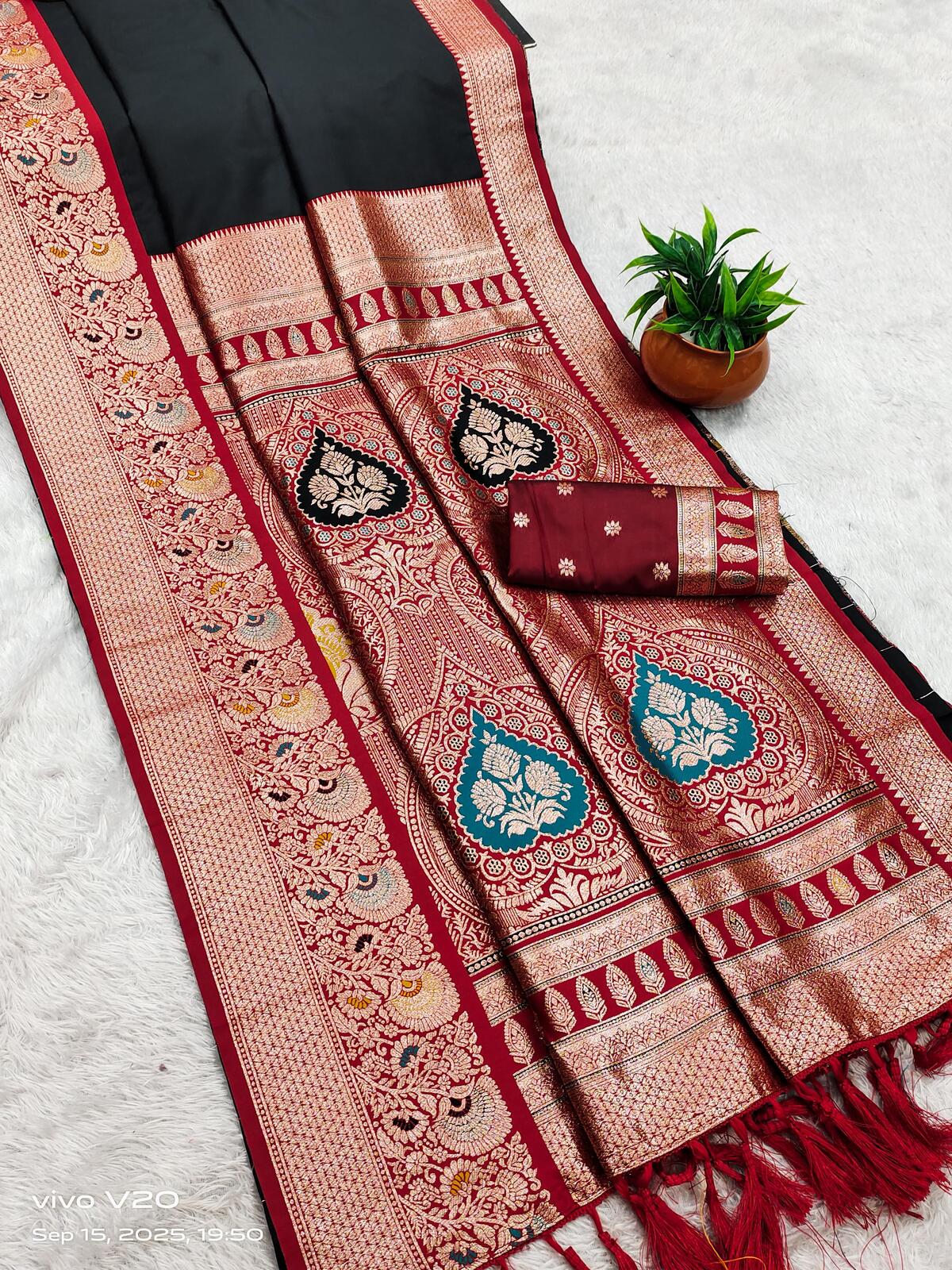 Amazing Black Soft Banarasi Silk Saree With Stylish Blouse Piece