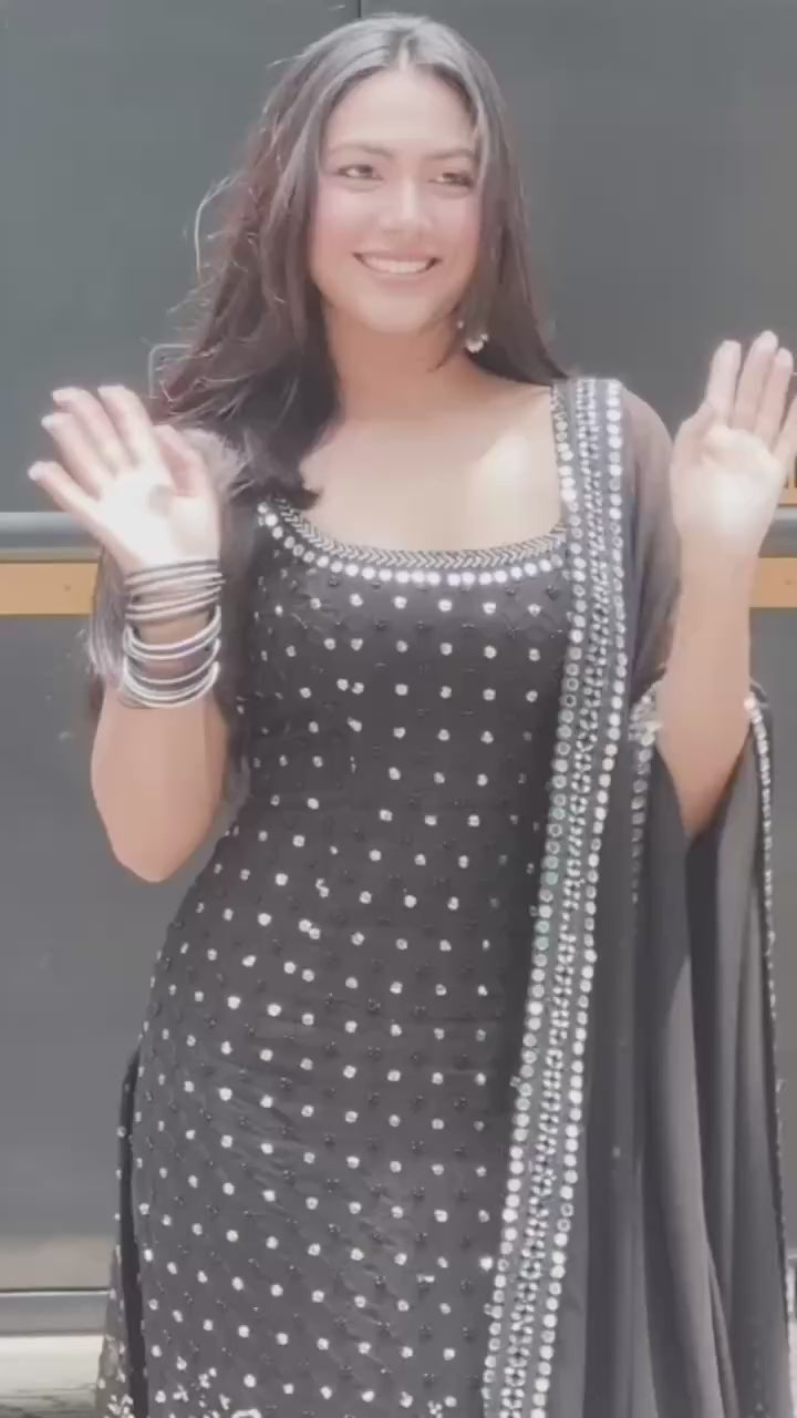 The sleeveless straight-fit kurta features delicate all-over mirror work with beautifully patterned detailing along the hem, creating a striking monochrome look. The mirror-embellished neckline adds a refined sparkle, while the matching solid pant ensures comfort and effortless wear. Completing the ensemble is a lightweight dupatta finished with a coordinated mirror-work border, adding balance and grace to the outfit.