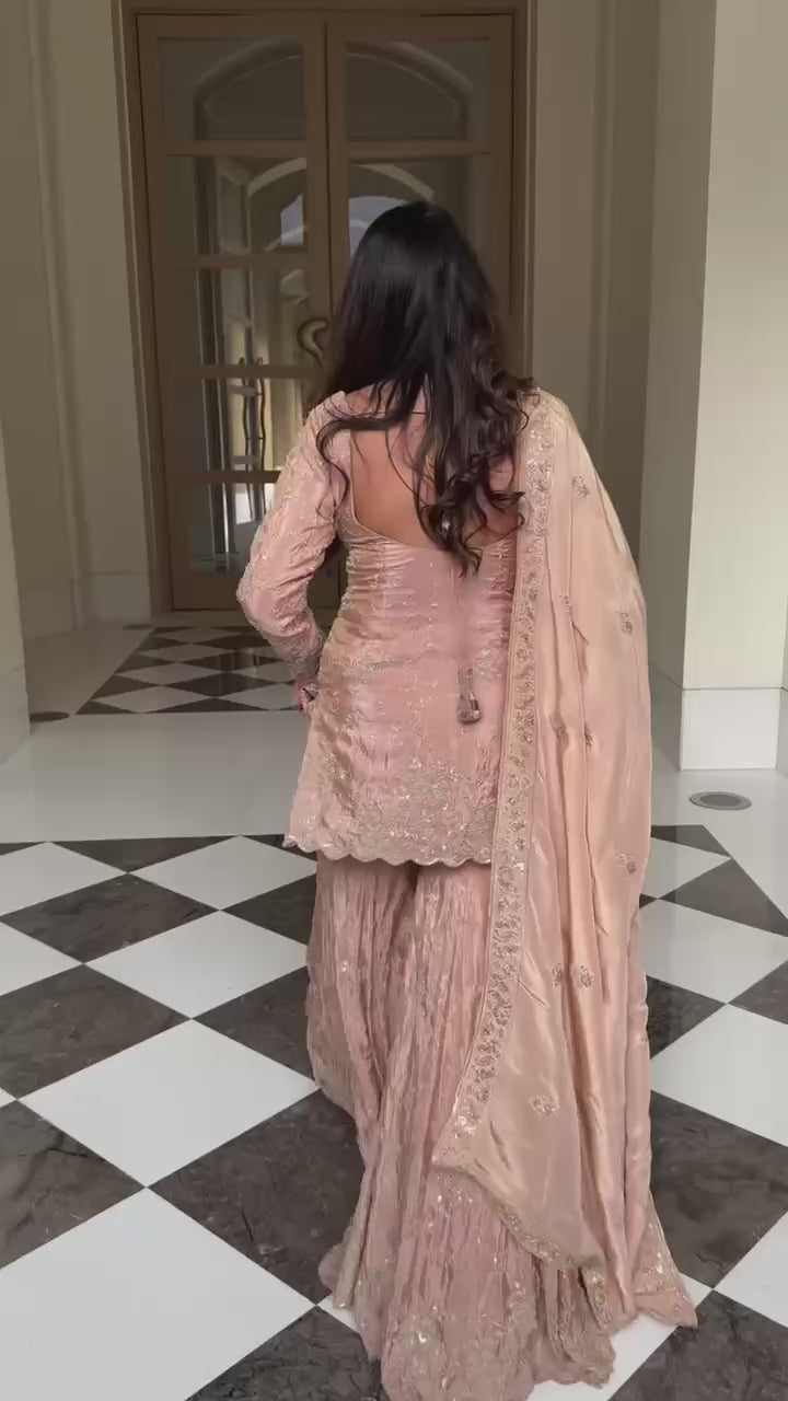 Step into understated royalty with this blush peach luxury kurta sharara set, designed for timeless elegance and graceful celebration. Crafted in a soft, flowy fabric base, the kurta is beautifully adorned with intricate floral embroidery in delicate silver tones, enhanced with fine threadwork that creates a rich yet refined look.