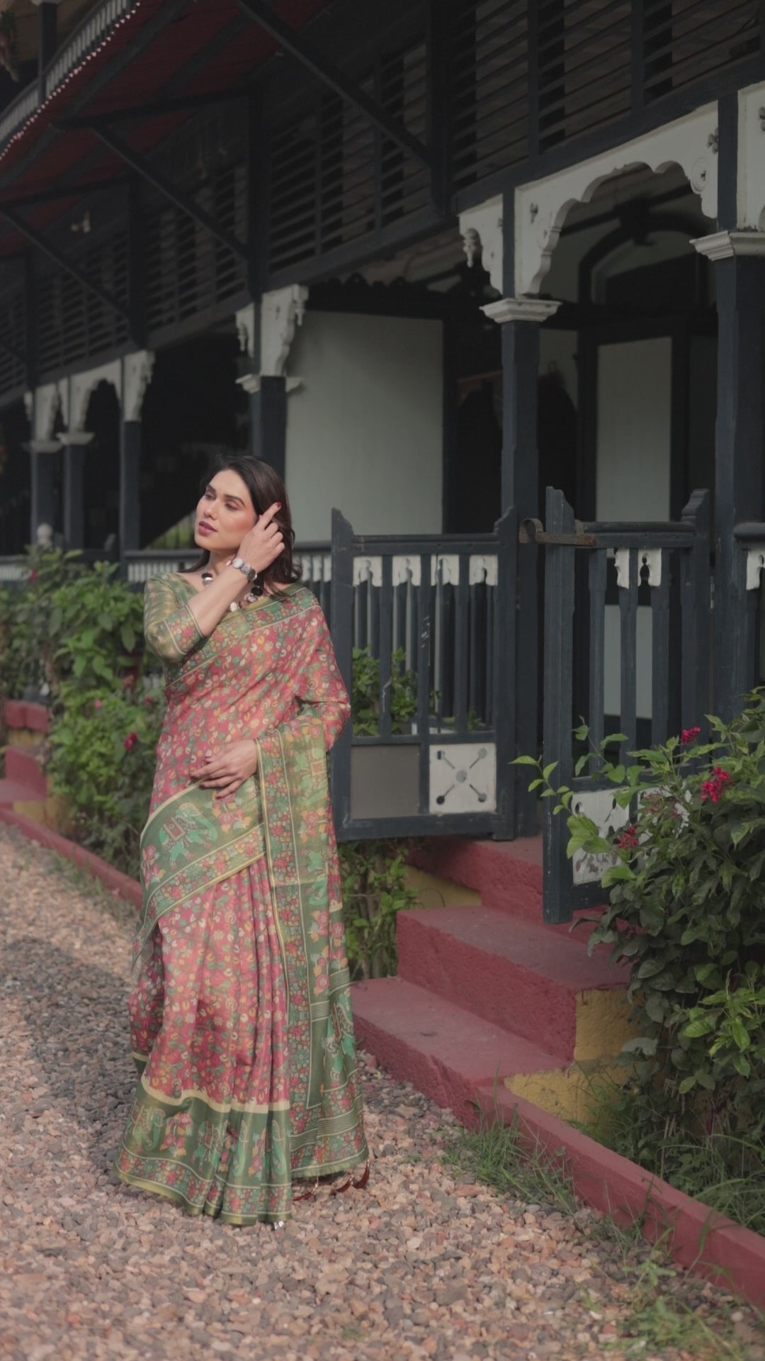 Bring home timeless tradition blended with artistic charm in this Bottle Green Printed Silk Saree. Featuring a beautiful contrast of rose pink floral patterns across the body, this saree stands out with its heritage-inspired elephant motifs that add a regal, handcrafted feel.