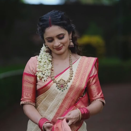 This elegant cream silk saree is beautifully designed with subtle woven patterns that give it a rich and graceful look. The saree is enhanced with a soft peach and pink woven border and pallu, adding a festive and traditional charm. Crafted from premium silk blend fabric, it offers a smooth texture and excellent drape. Perfect for weddings, festive celebrations, traditional functions and special occasions, this saree is an ideal choice for women who love classic colors with a refined finish.