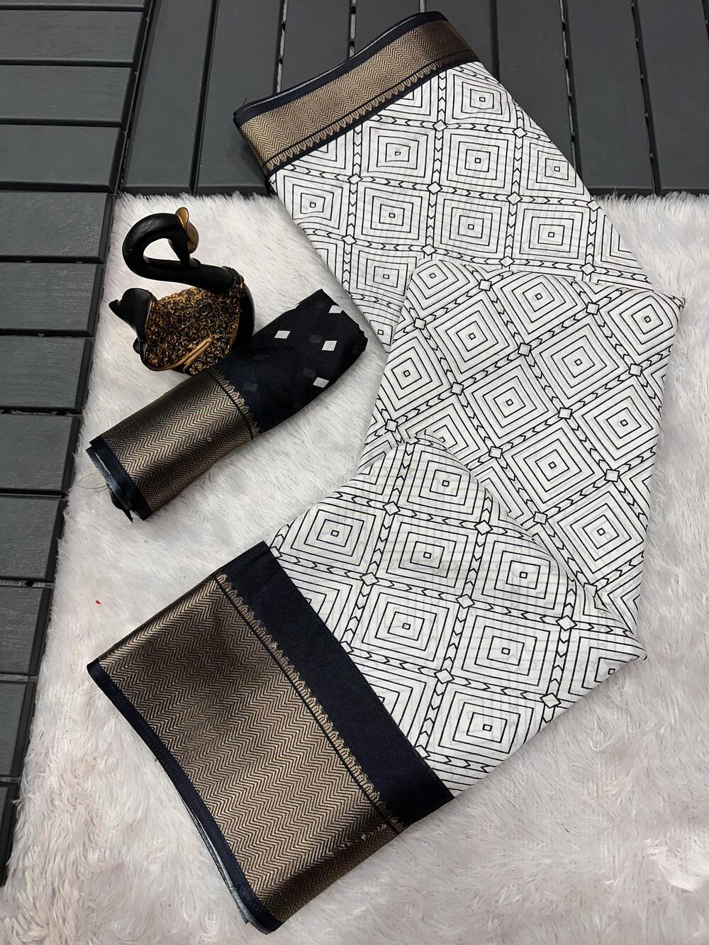 Cynosure Off White Digital Printed Dola Silk Saree With Tremendous Blouse Piece