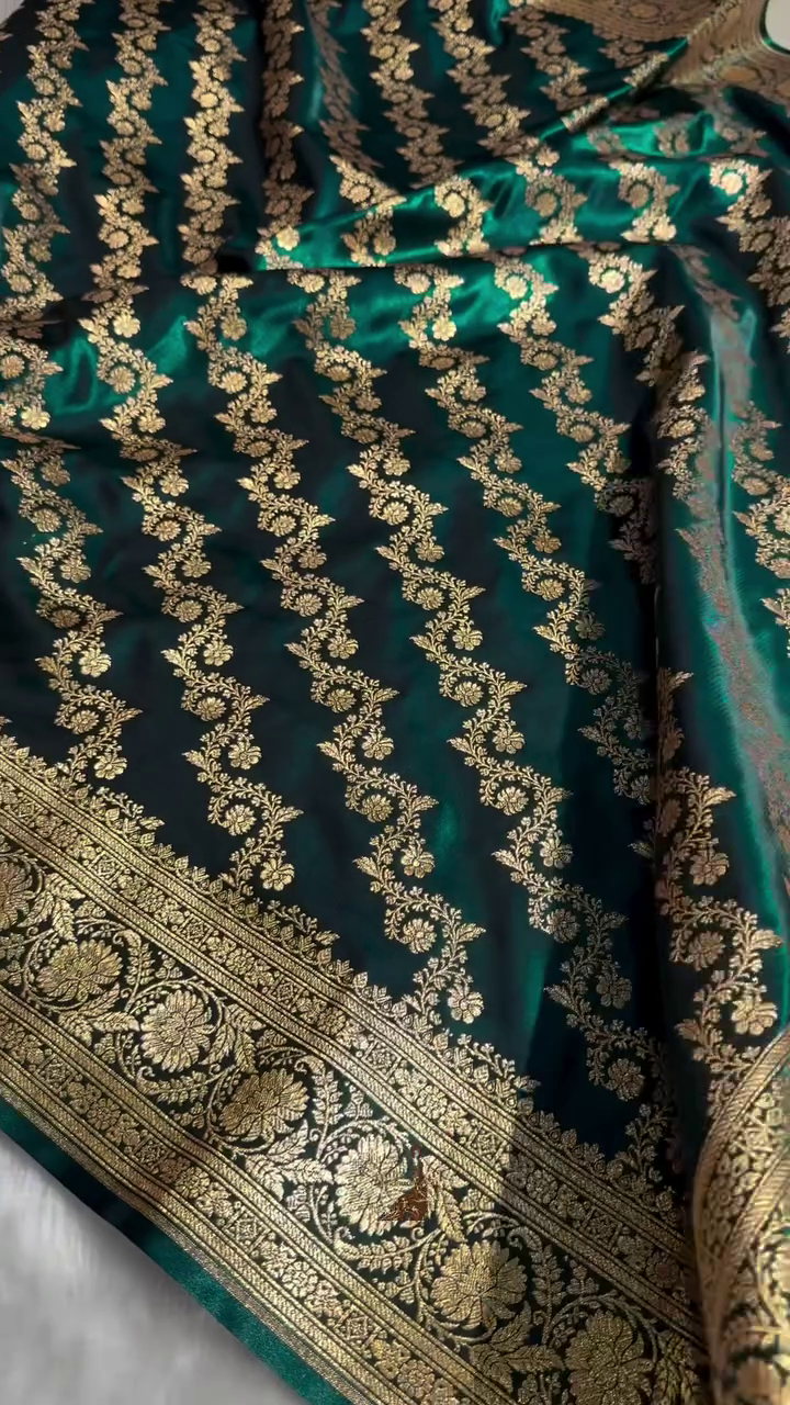 Make a statement of timeless elegance with this luxurious Dark Teal Green Banarasi Silk Saree. Crafted from premium silk, the saree features an all-over intricate gold zari floral jaal weaving that exudes royal charm. The deep green tone paired with shimmering zari work creates a rich, sophisticated look, perfect for grand occasions.