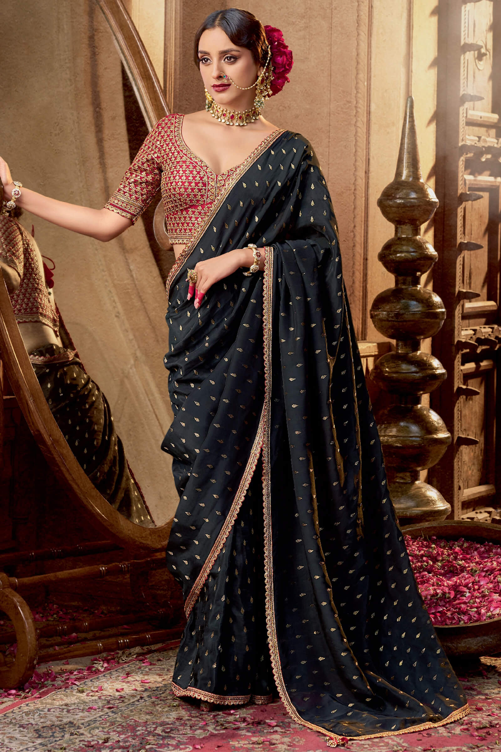 SAREE SPECIFICATIONS: Fabric: Pure Viscose Crape Silk Colour: Black Work Type: Zari Weaving + Lace Border