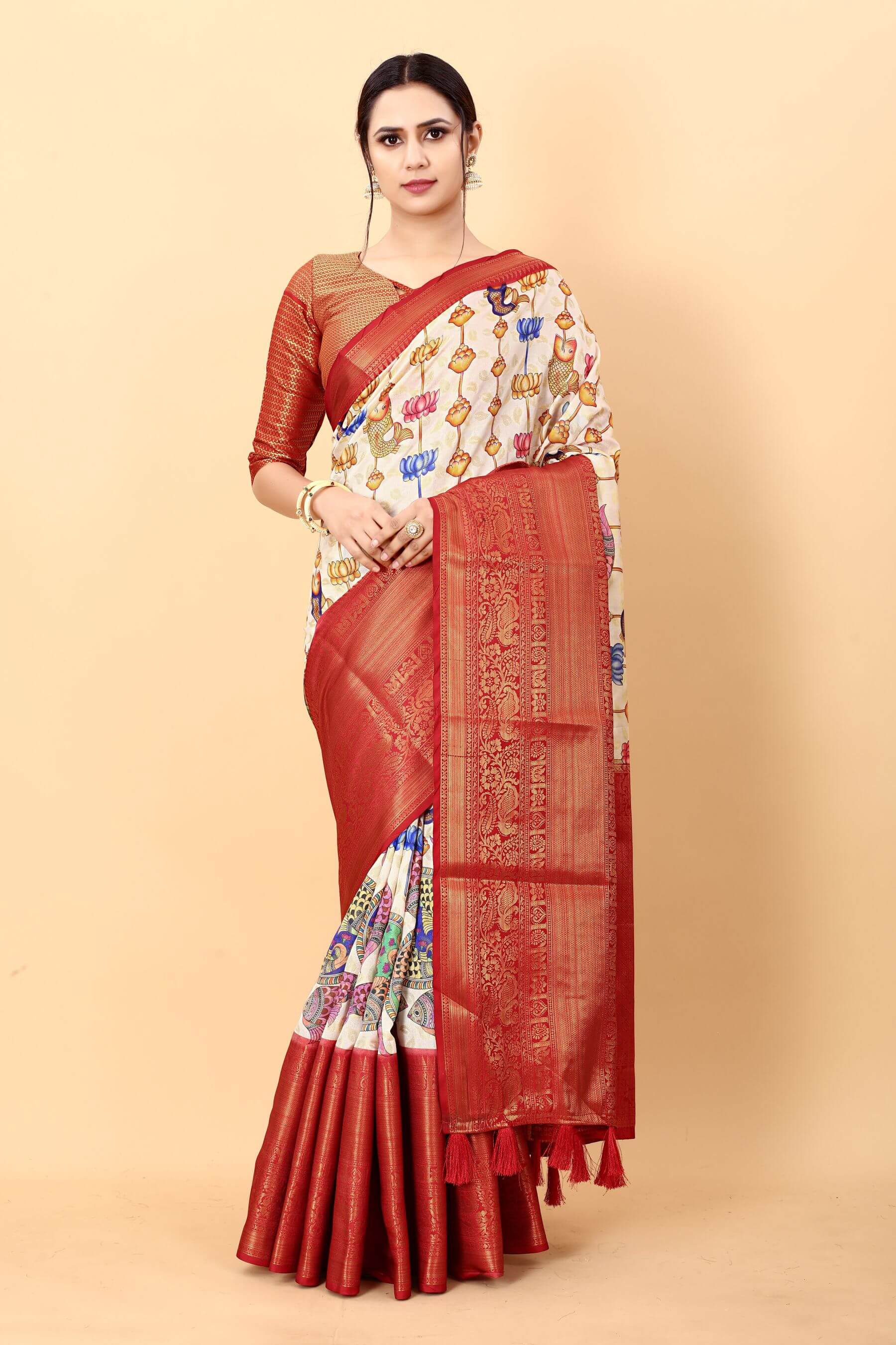 SAREE SPECIFICATIONS: Fabric: Soft Silk Colour: Beige Work Type: Jacquard & Digital Printed