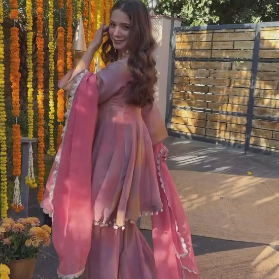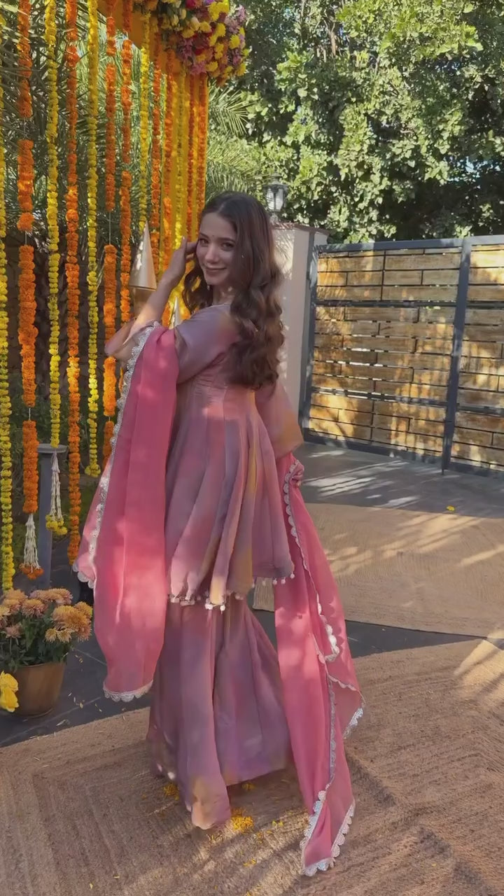 Dusty Rose Mirror Work Sharara Suit with Scalloped Dupatta