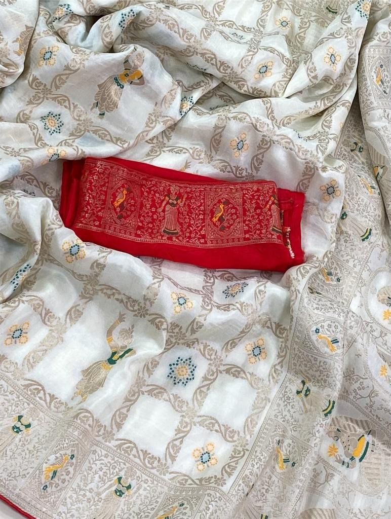Embrocation White Dola Silk Saree With Murmurous Blouse Piece