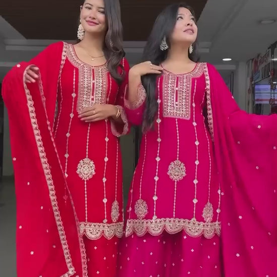 Embroidered Kurti Sharara Set with Dupatta – Red & Rani Pink