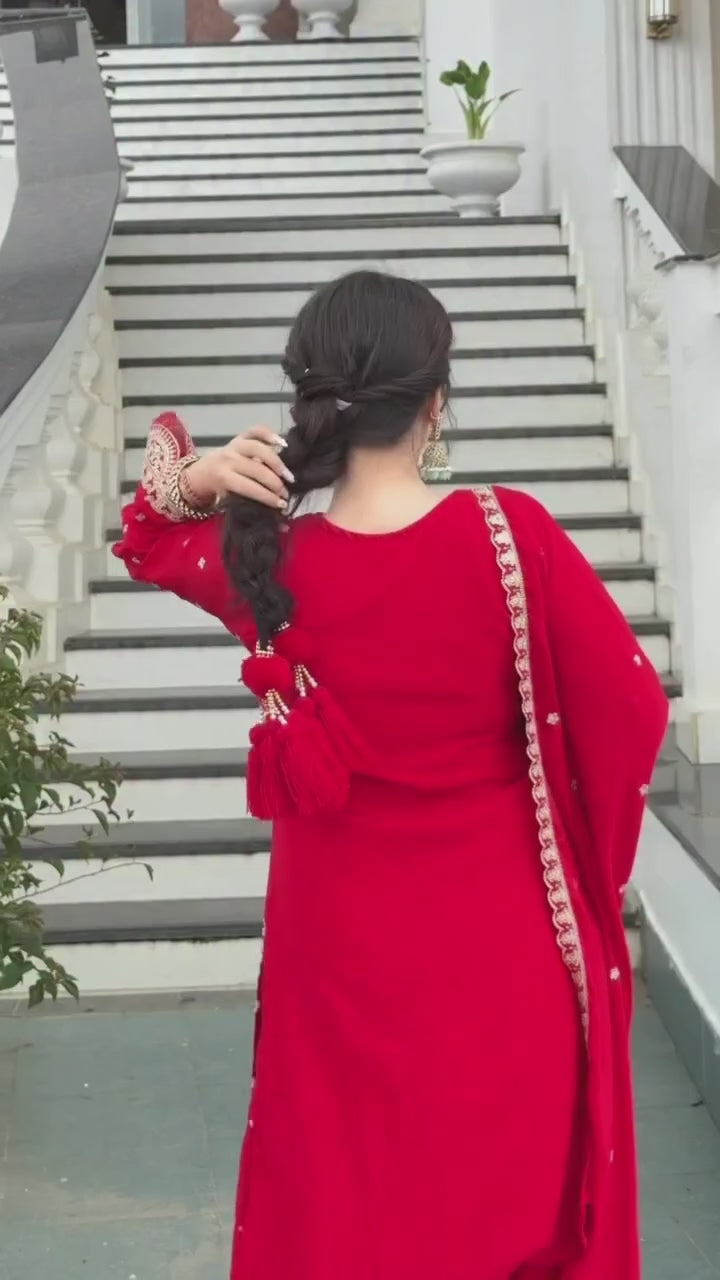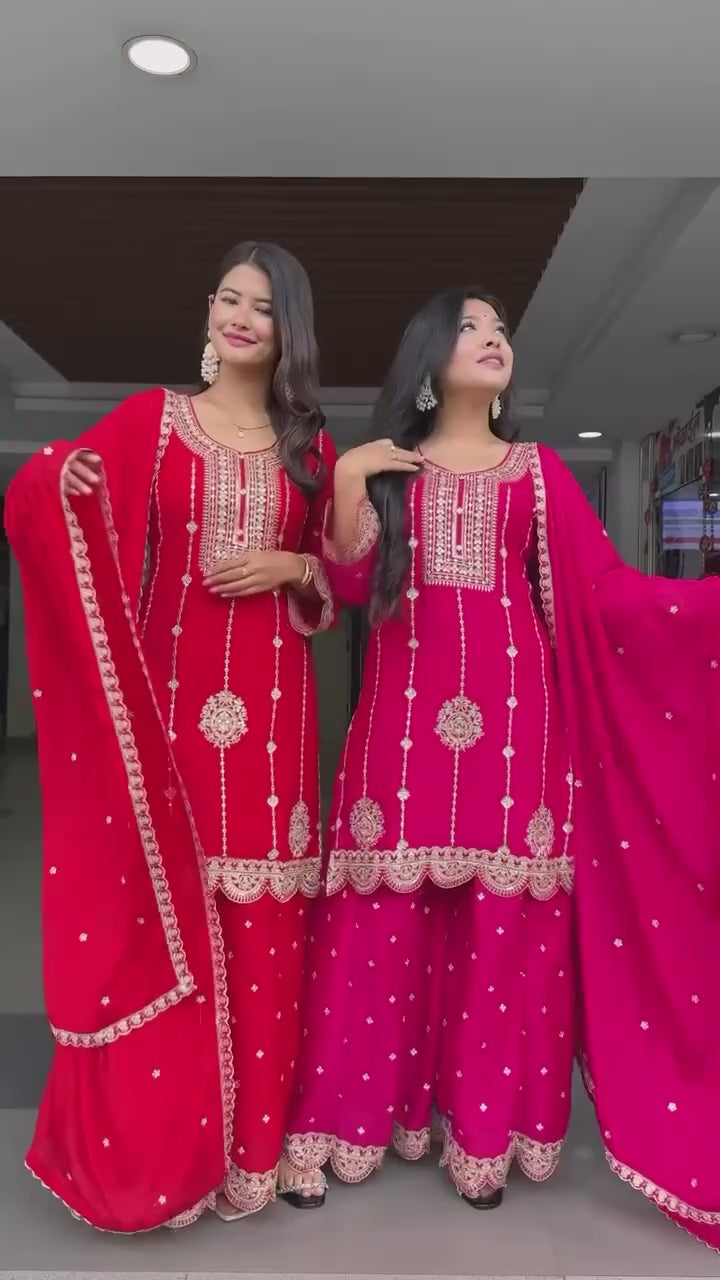 Make a bold festive statement with this beautifully crafted Embroidered Kurti Sharara Set, available in two stunning colors – Classic Red and Rani Pink. The straight-cut kurti features elegant vertical embroidery and a richly detailed neckline, creating a graceful and elongating look.
