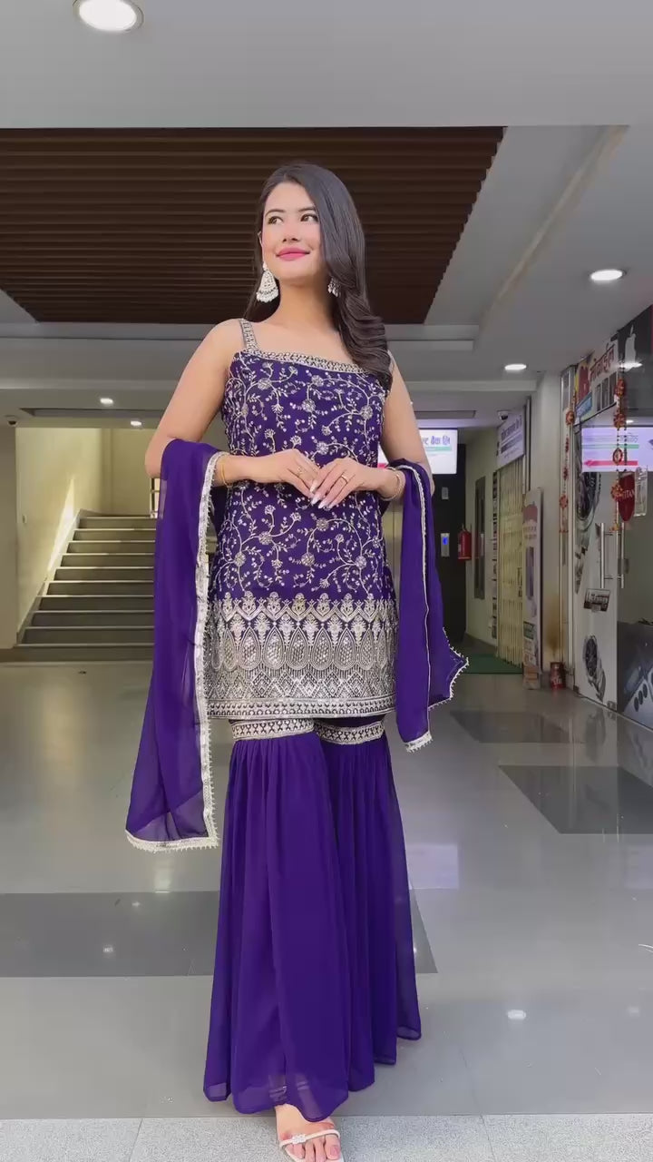Embroidered Sleeveless Kurti Sharara Set with Dupatta – 2 Color Options (Pink & Purple) | Festive Party Wear for Women