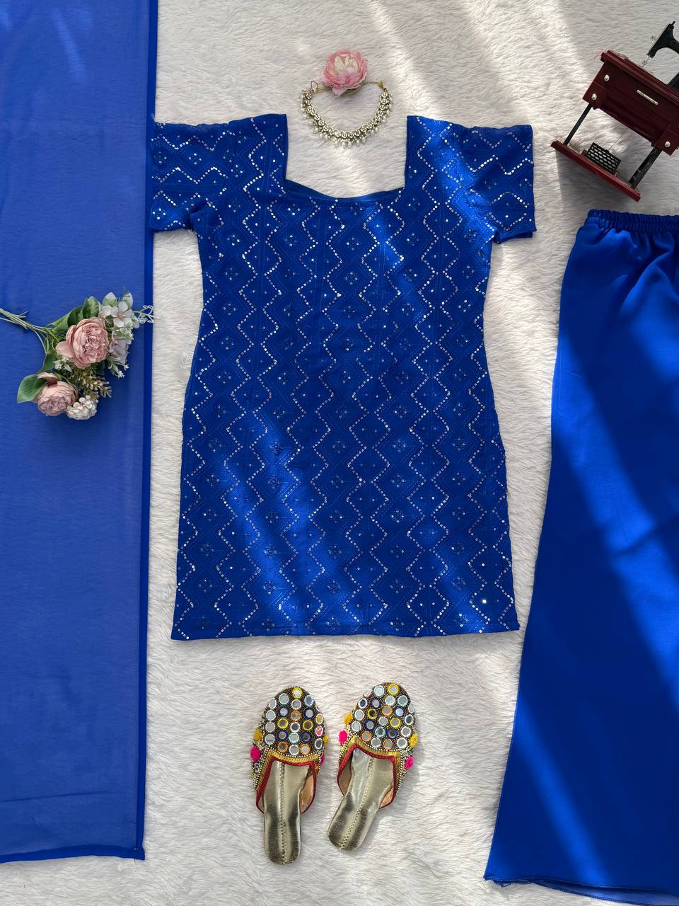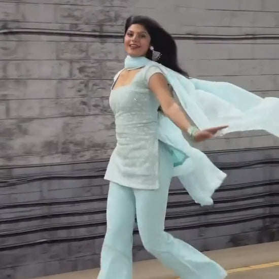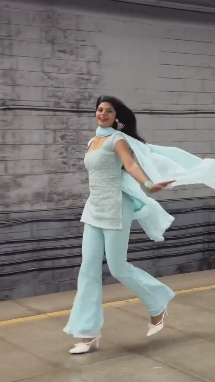 Paired with flowy palazzo pants and a soft sheer dupatta, this set is lightweight, breathable, and perfect for day-to-evening celebrations. Available in three stunning colors, it’s a versatile choice for festive gatherings and special occasions.