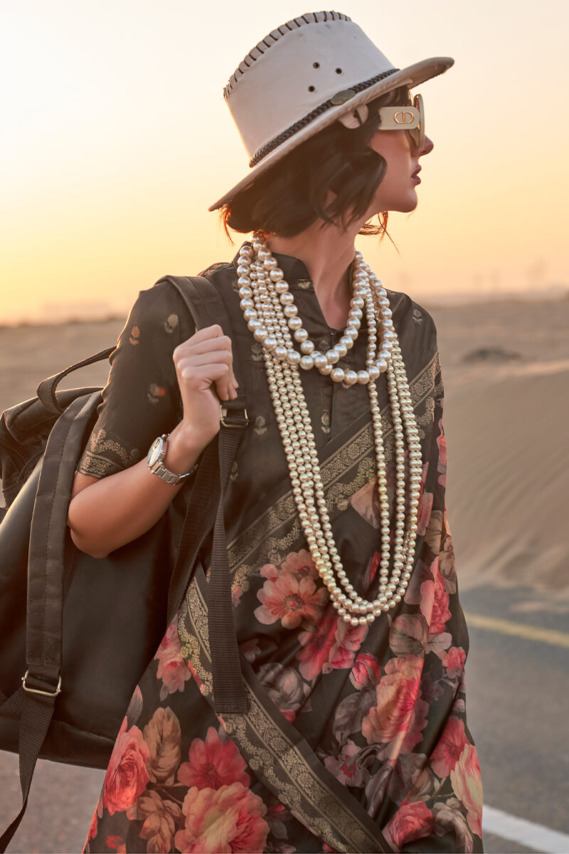 Exquisite Black Digital Printed Tussar Silk Saree With Groovy Blouse Piece