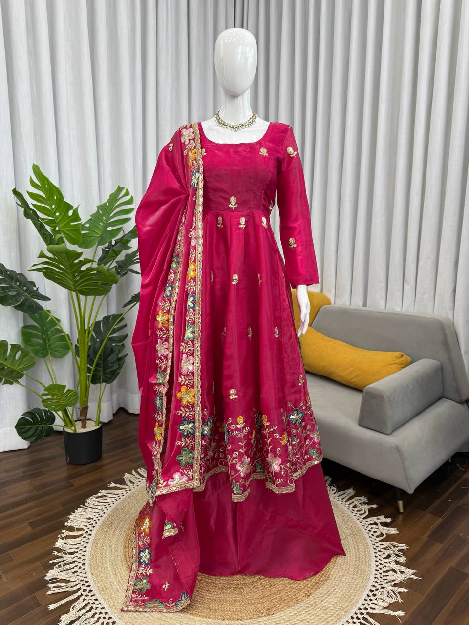 Make a graceful statement with this stunning Fuchsia Pink Anarkali Suit, designed to bring together elegance and festive charm. Crafted in a rich flowy fabric, the Anarkali features delicate floral embroidery with multicolor thread and subtle zari detailing, adding depth and vibrancy to the look.