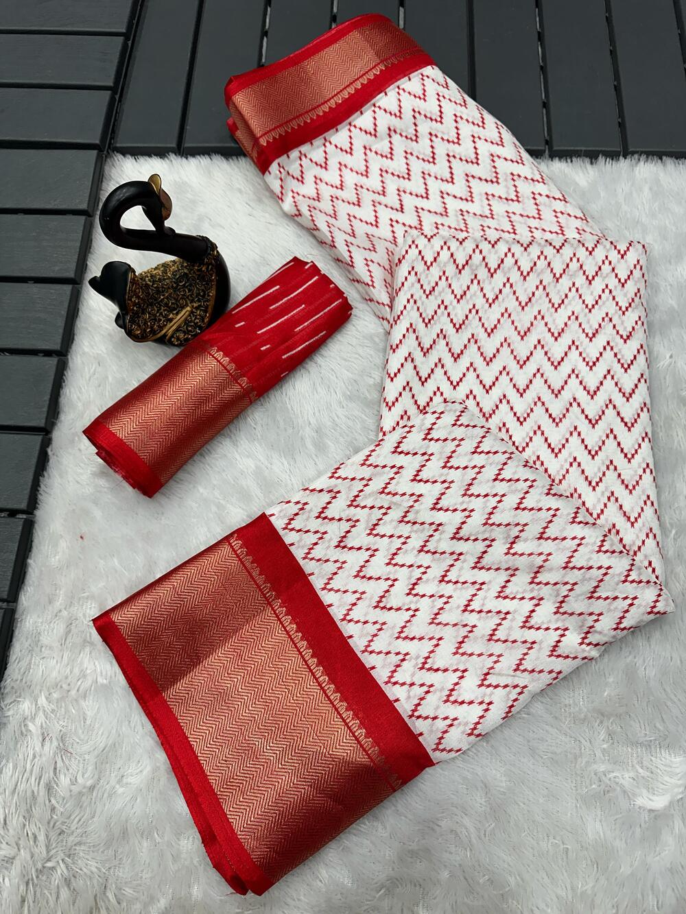 BLOUSE SPECIFICATION: Fabric: Dola Silk Colour: Red Work Type: Digital Printed & Jacquard Weaving Stitching Type: Unstitched