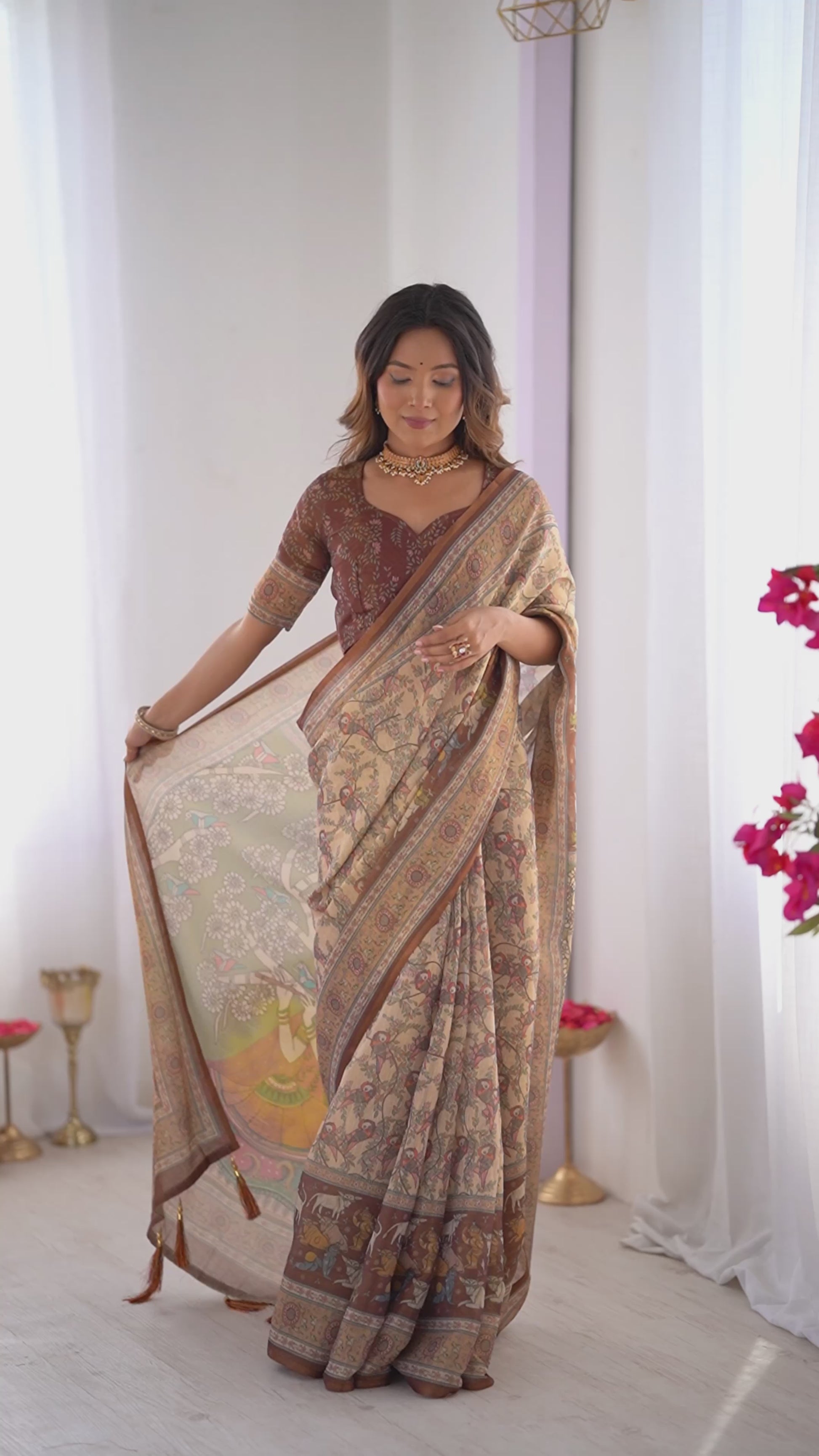 Step into timeless elegance with this luxury Kalamkari-inspired printed saree, a celebration of Indian artistry and refined craftsmanship. Crafted on a soft, fluid fabric, this saree showcases intricate heritage motifs, storytelling prints, and an exquisitely detailed artistic pallu, making it a true collector’s piece.