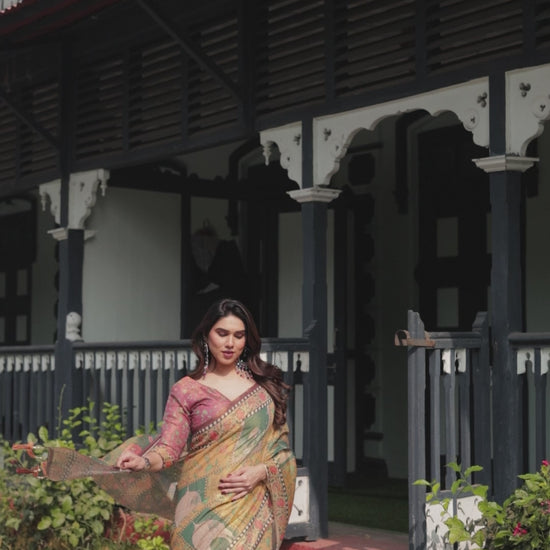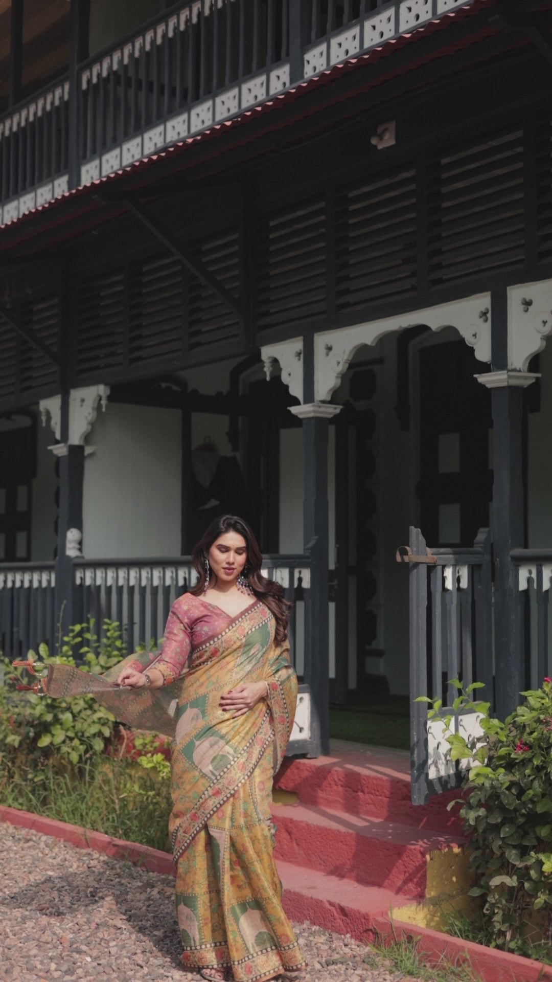 Rooted in timeless tradition and elevated with contemporary elegance, this heritage green Kalamkari-inspired printed saree is a celebration of Indian folk artistry. The saree features a beautifully balanced palette of earthy green, warm beige, muted rust, and soft floral accents, creating a rich yet soothing visual appeal.