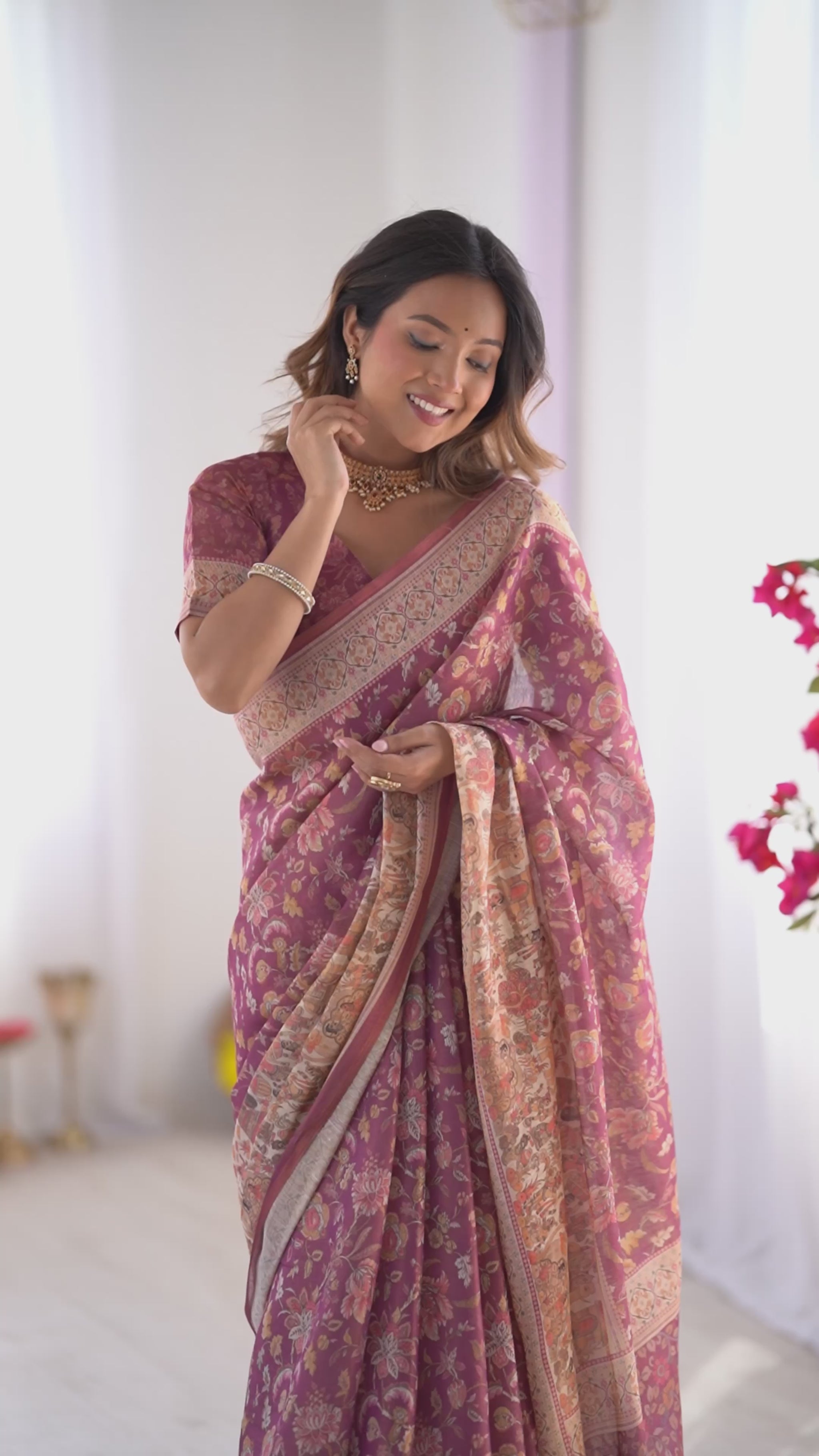 Celebrate timeless Indian artistry with this luxury Kalamkari-inspired printed saree, thoughtfully designed for women who admire heritage with a contemporary soul. Rendered in a graceful mauve wine hue, this saree is adorned with intricate floral motifs across the body, creating a soft yet regal visual appeal.