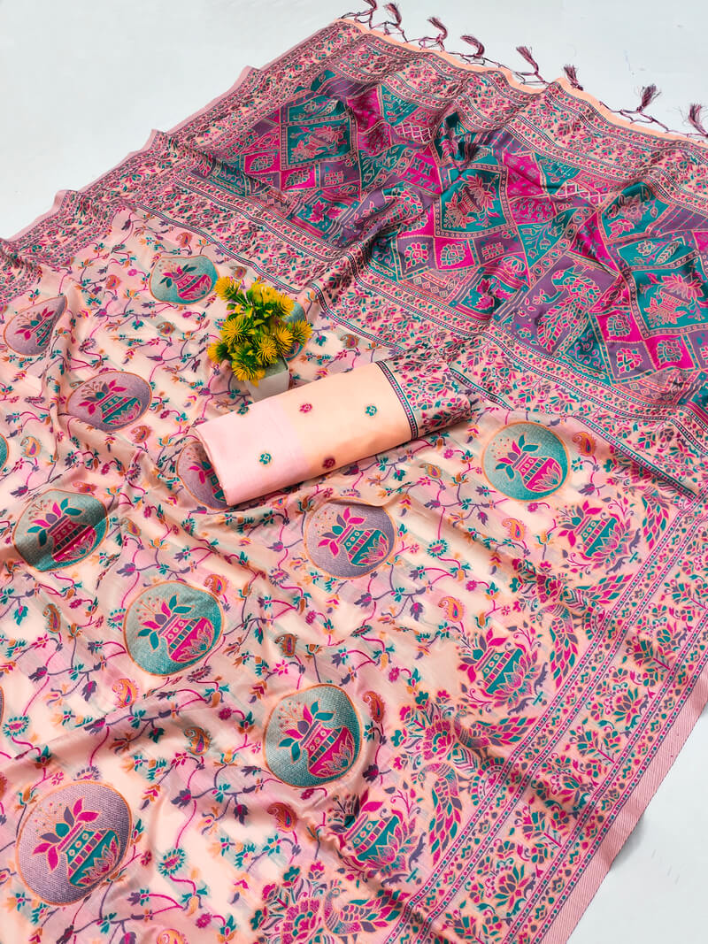 Ineffable Peach Pashmina Saree With Preferable Blouse Piece