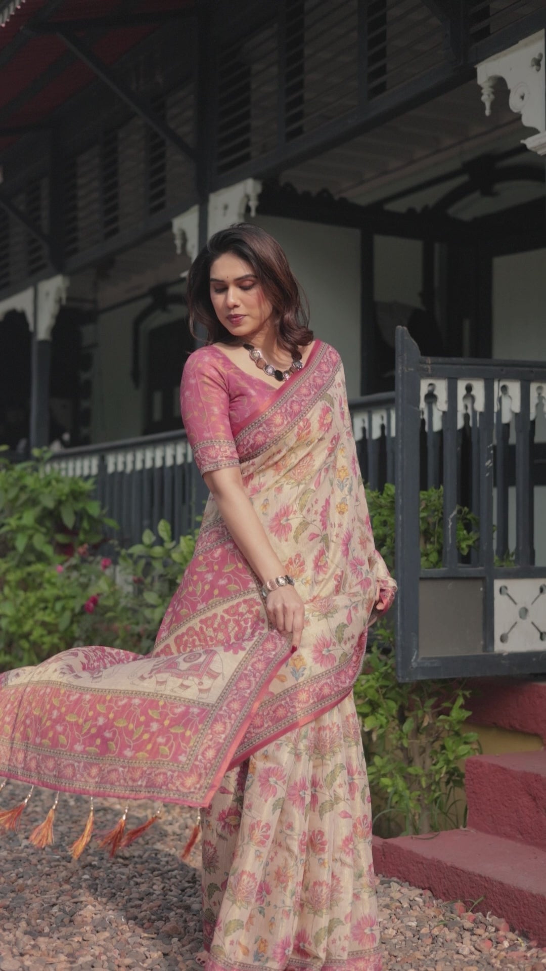 The saree is highlighted with a rich pink floral border that adds contrast and definition, complemented by an artistic printed pallu finished with elegant tassels for a classic ethnic finish. Lightweight yet luxurious, it’s perfect for all-day comfort without compromising on style.