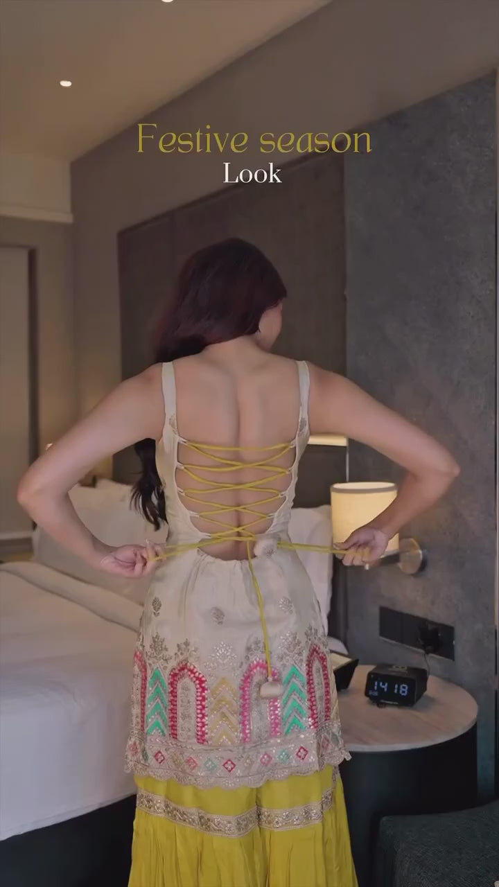 Brighten up your festive wardrobe with this ivory embellished kurti sharara set, designed with vibrant details and graceful flow. The sleeveless ivory kurti is highlighted with delicate sequin butti work and a beautiful multicolor embroidered hem, adding a playful yet elegant ethnic touch.