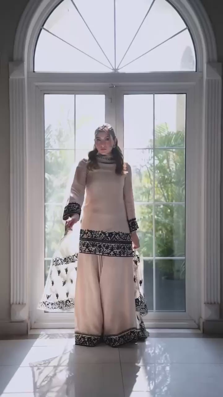 Paired with a flowy sharara adorned with a bold black border and a matching dupatta with coordinated prints, this set offers effortless elegance with comfort. Lightweight and breathable, it’s perfect for daytime festivities, casual celebrations, and elegant gatherings.