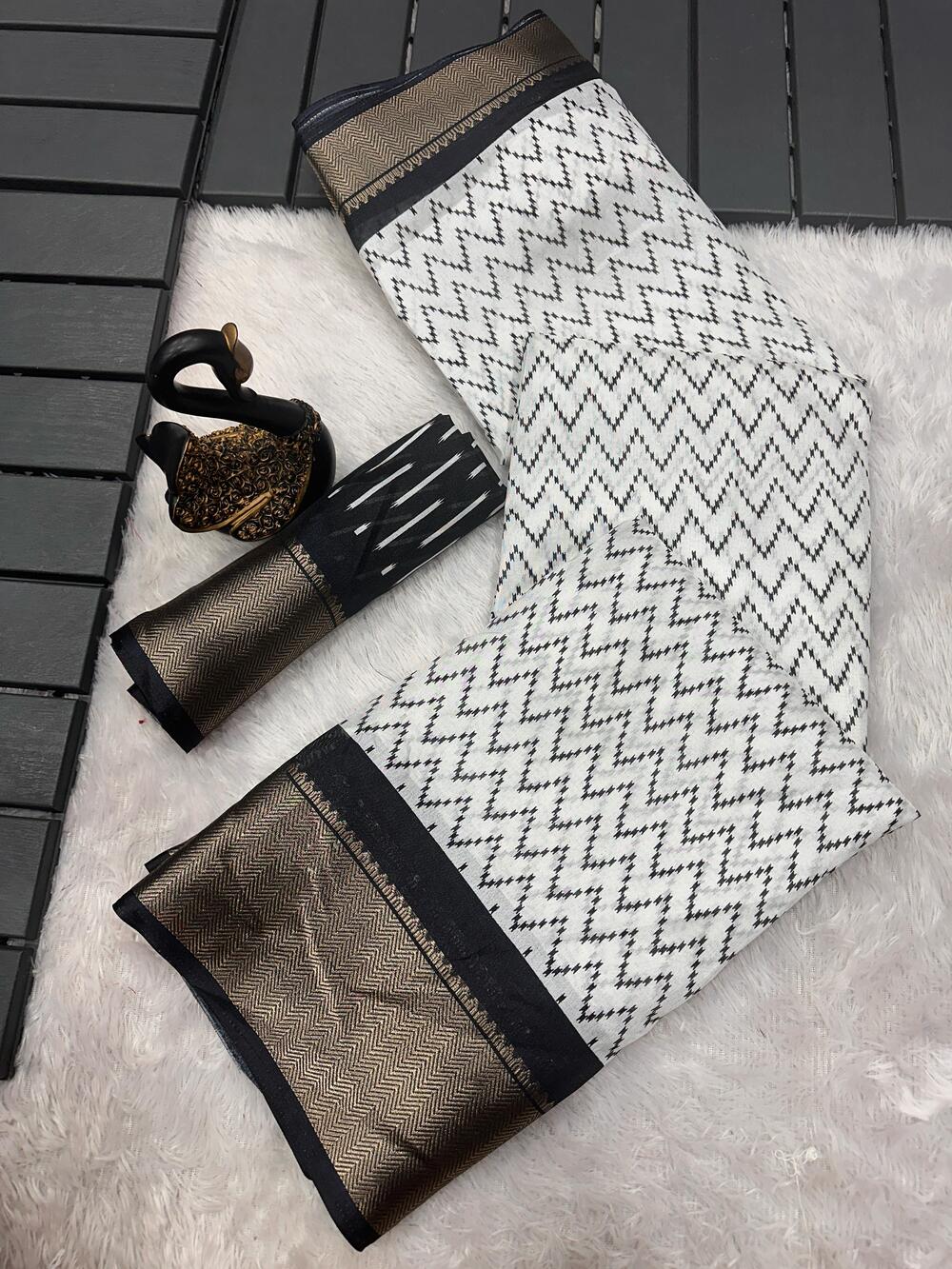 SAREE SPECIFICATIONS: Fabric: Dola Silk Colour: Off White Work Type: Digital Printed & Jacquard Weaving