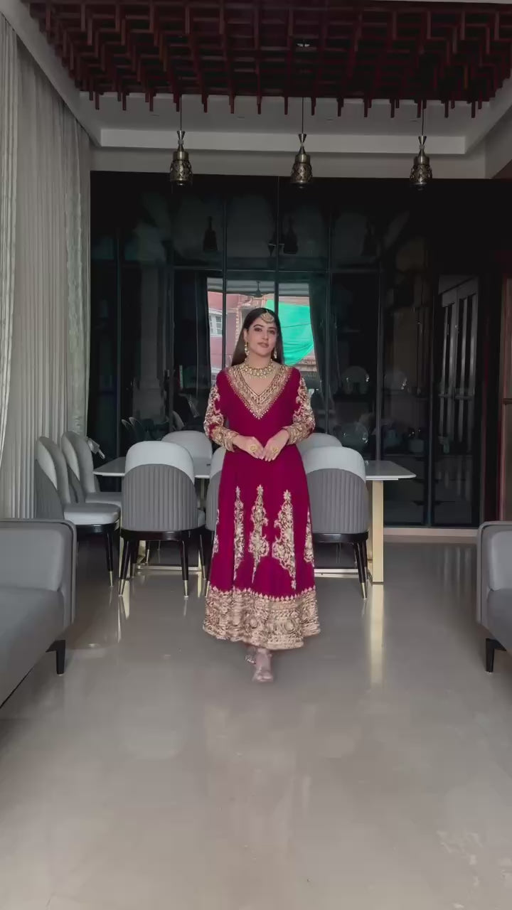 Rich maroon Anarkali with heavy golden embroidery