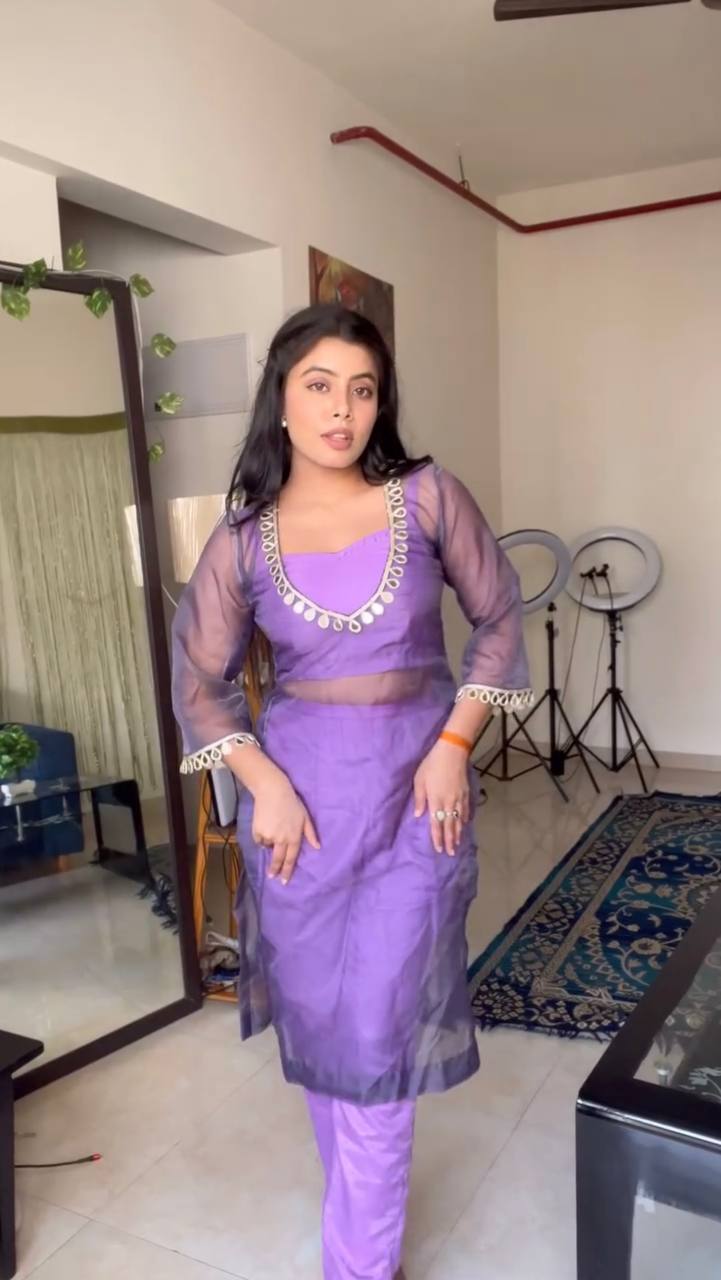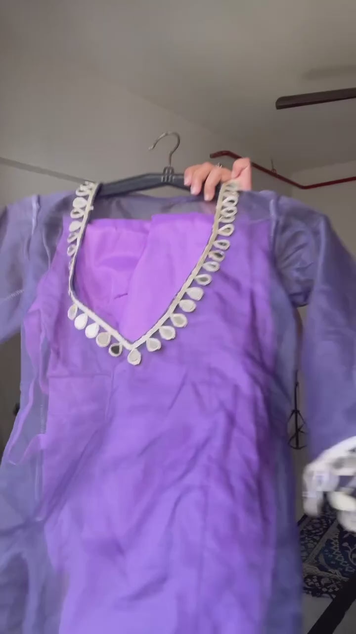 Add a touch of modern elegance to your festive wardrobe with this beautifully crafted organza kurti set, designed for effortless grace and comfort. The sheer organza kurti features a stylish V-neckline adorned with delicate mirror work detailing, perfectly complemented by matching sleeve accents. Paired with a smooth satin inner blouse and satin pants, this set offers a chic layered look ideal for festive gatherings, parties, and special occasions.