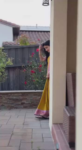 Embrace a vibrant and sophisticated aesthetic with this stunning Mustard Yellow and Lavender Silk Saree. This ensemble features a bold mustard yellow body that beautifully contrasts with a soft lavender pallu and border, creating a modern yet traditional look. Crafted with high-quality silk, it offers a graceful drape and a subtle, refined sheen perfect for any special occasion.