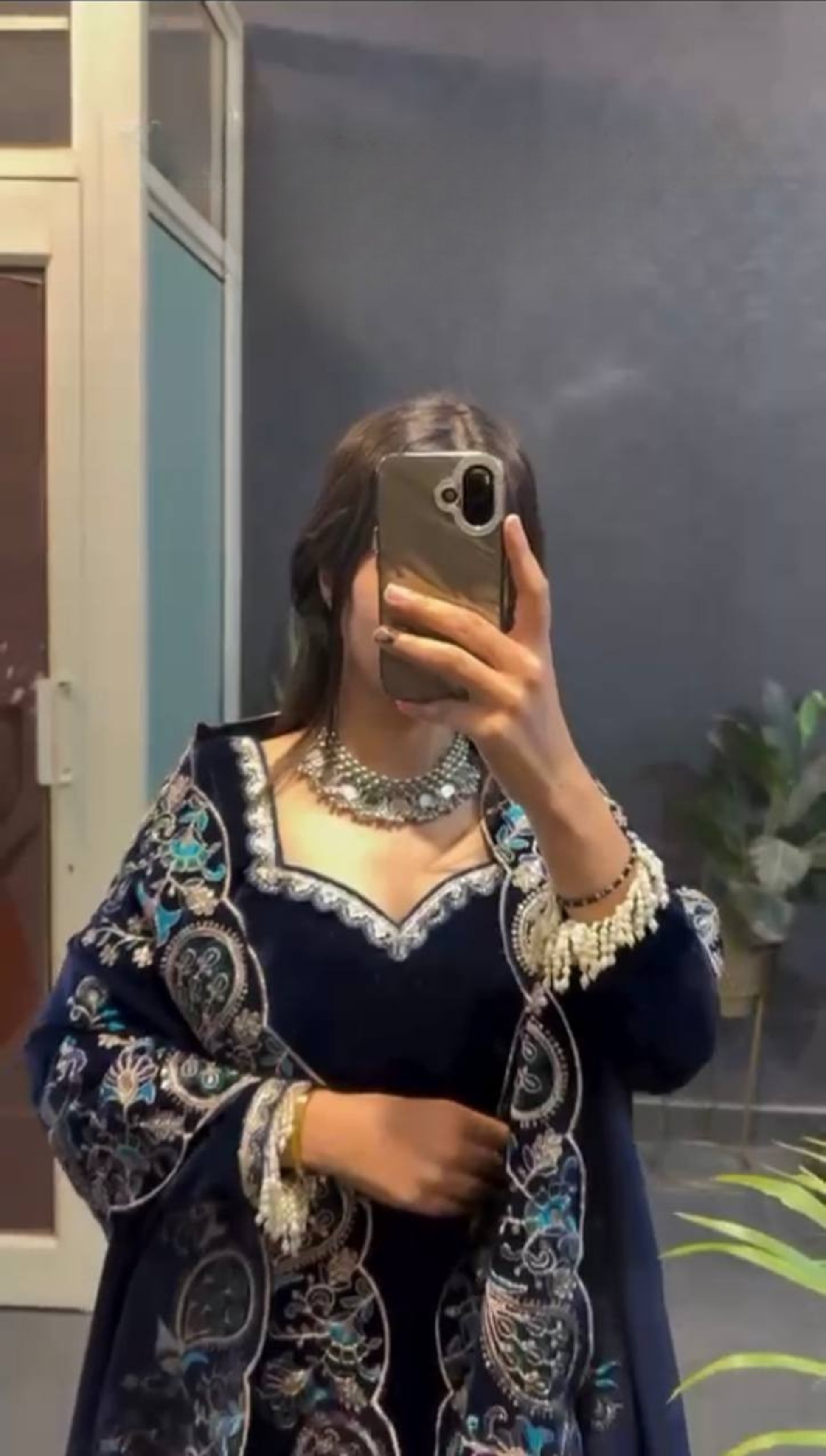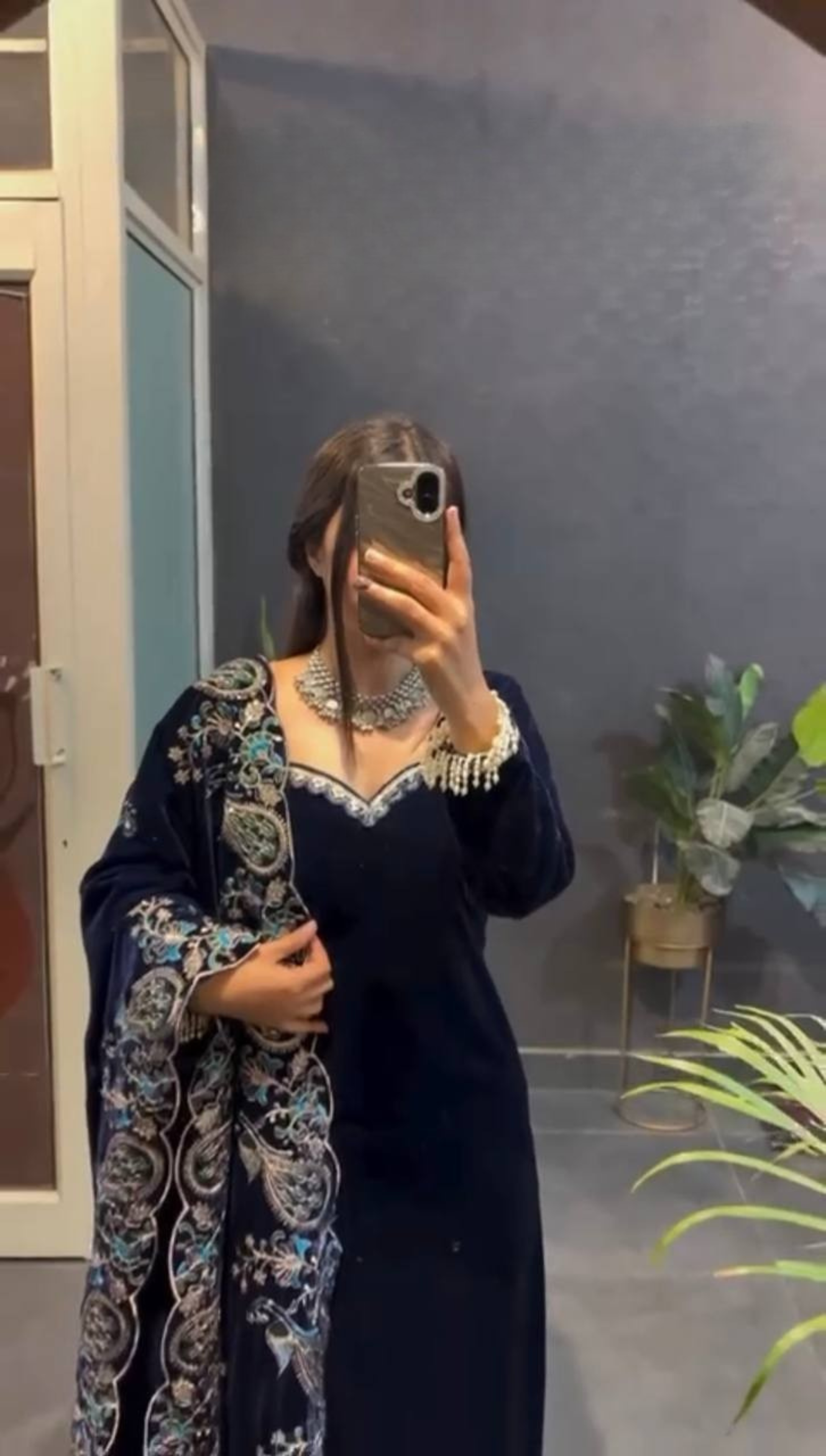 Add royal elegance to your ethnic wardrobe with this Navy Blue Velvet Kurti Pant Set, designed to deliver a rich and luxurious look. Crafted in premium velvet fabric, this set features a beautifully finished kurti paired with matching pants and an exquisitely embroidered dupatta.