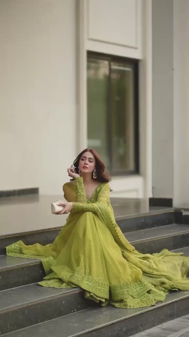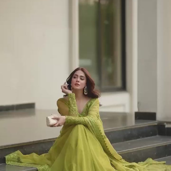 This olive green net Anarkali suit set is designed for women who love understated elegance. The soft net fabric paired with intricate embroidery creates a graceful festive look while keeping you comfortable throughout the day or evening.
