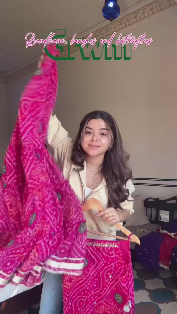 Add a pop of vibrant charm to your festive wardrobe with this pink bandhani print kurti sharara set. Designed with a sleeveless spaghetti-strap kurti, this outfit showcases classic bandhani-inspired patterns enhanced with subtle mirror and lace detailing along the neckline.