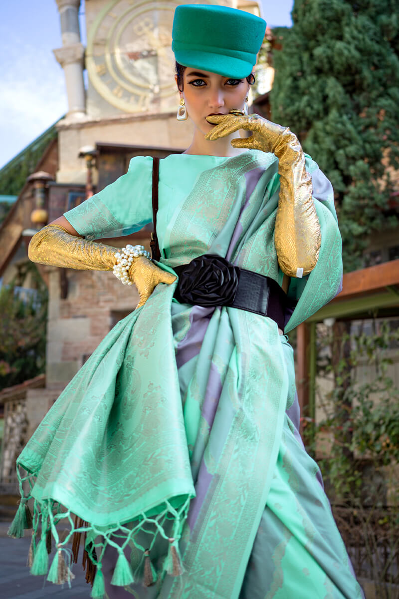 Prettiest Turquoise Soft Banarasi Silk Saree With Blooming Blouse Piece