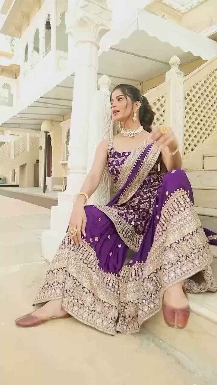 Step into elegance with this stunning purple embroidered kurta sharara set, crafted to make you stand out at festive occasions and celebrations. The sleeveless kurta is adorned with delicate all-over silver embroidery and a richly detailed hem, adding a luxurious touch to the outfit.