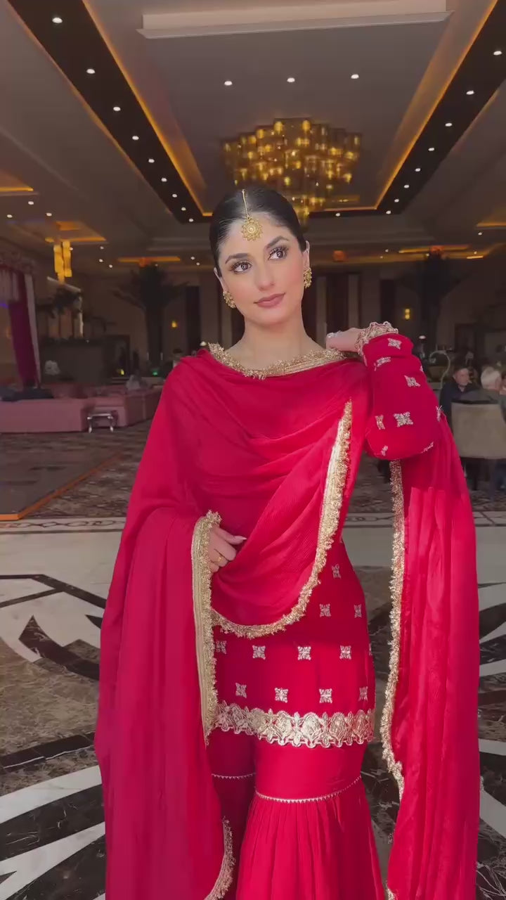 Make a graceful festive statement with this Red Embroidered Kurta Sharara Suit Set, crafted for elegance and comfort. The straight-cut kurta is adorned with delicate all-over embroidery, beautifully complemented by a flowy sharara featuring layered flair and subtle detailing. A matching sheer dupatta with a rich embroidered border completes the look.