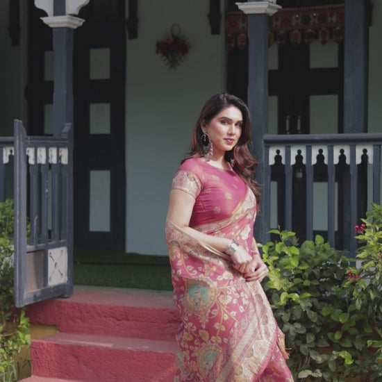 The highlight lies in its beautifully detailed border and designer pallu, showcasing intricate traditional motifs and artistic patterns in harmonious pastel and earthy tones. The warm rose pink base enhances the richness of the design, making it a perfect choice for festive occasions, daytime celebrations, and elegant gatherings.