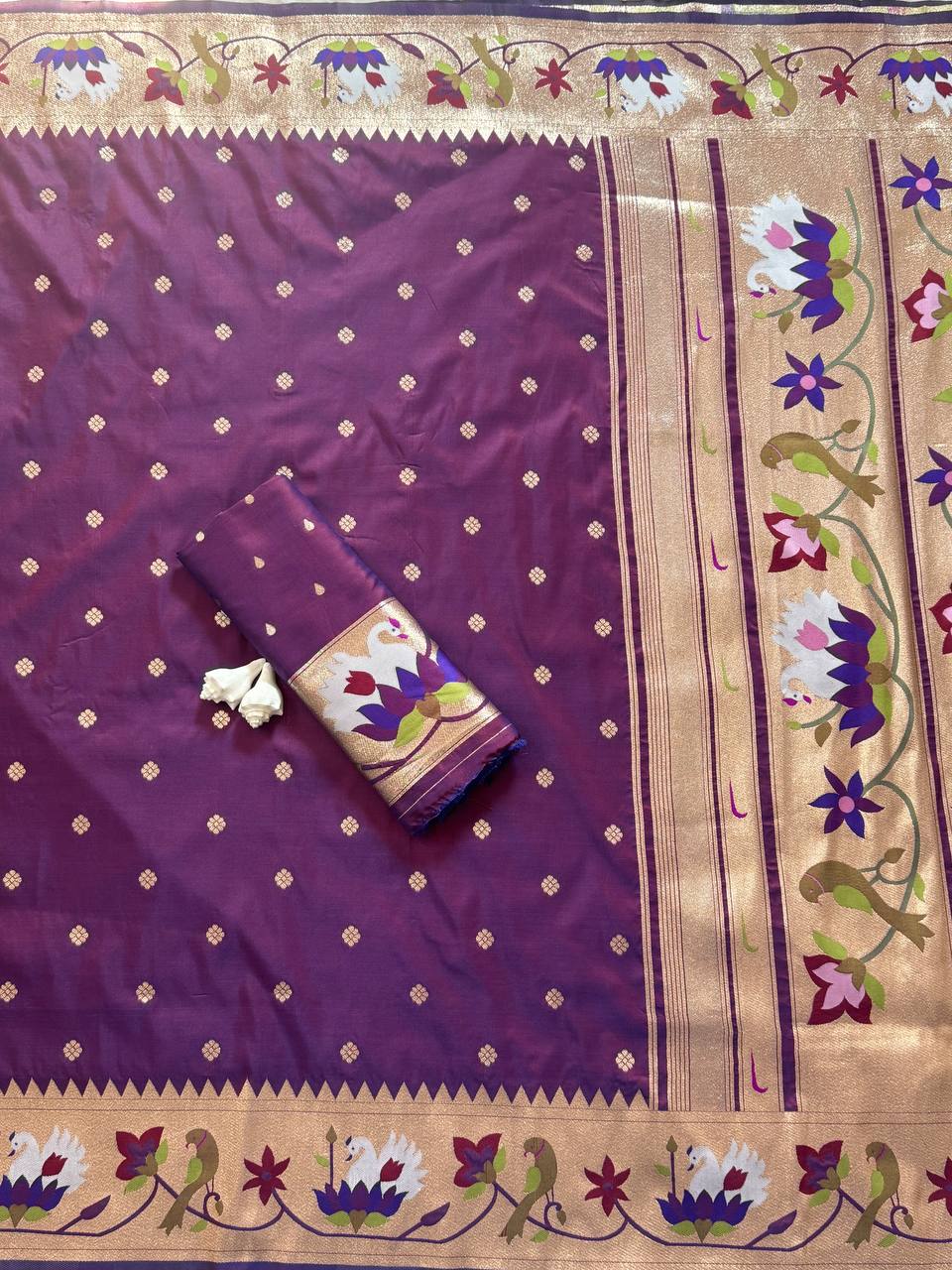 Indulge in regal elegance with this royal plum purple premium luxury silk saree, exquisitely crafted to reflect timeless heritage and contemporary sophistication. The rich plum-purple base exudes depth and royalty, adorned with delicate gold zari butti motifs that shimmer gracefully across the body, lending a refined and luxurious charm.