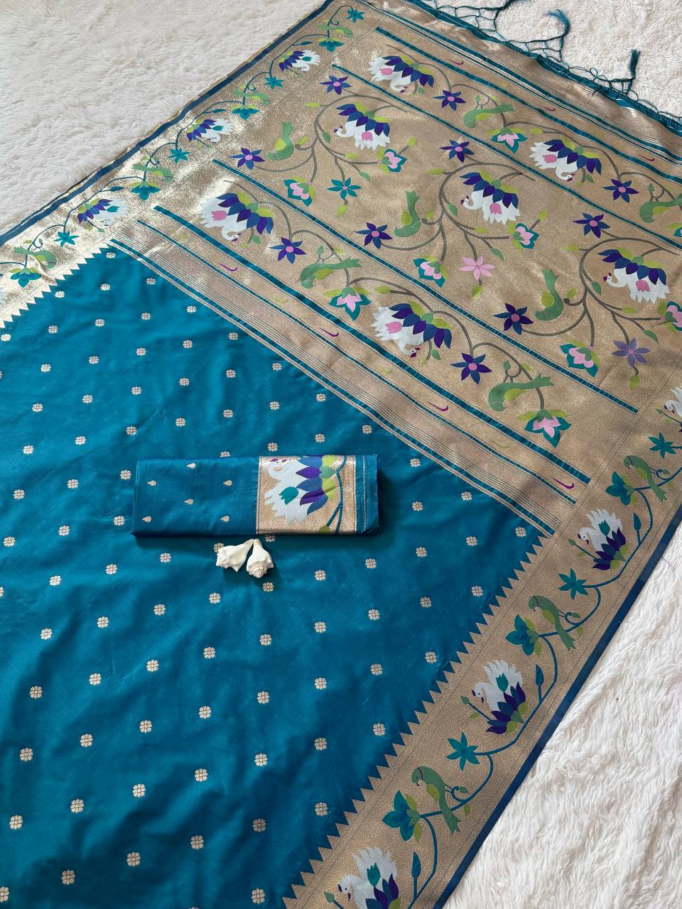 Step into refined elegance with this royal teal blue premium luxury silk saree, a perfect blend of heritage craftsmanship and contemporary sophistication. The rich teal blue body radiates a serene yet opulent charm, beautifully enhanced with delicate gold zari butti motifs scattered evenly across the fabric, creating a subtle shimmer with every movement.