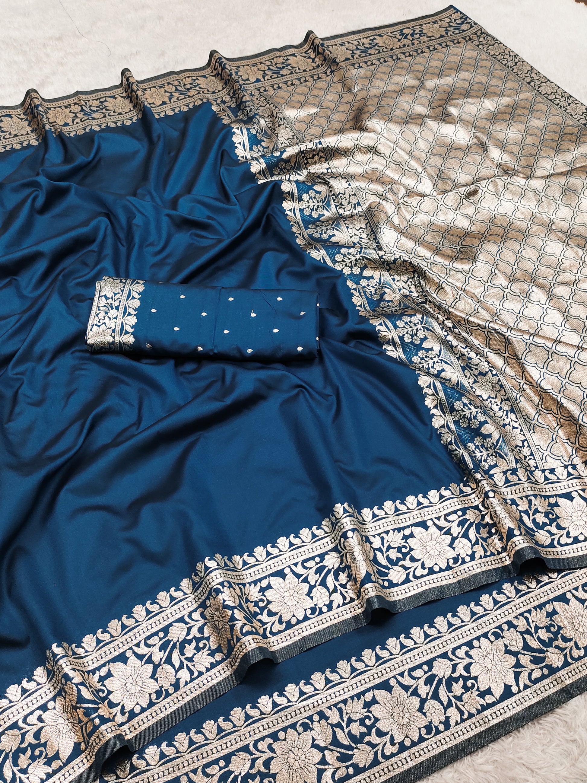 Elevate your ethnic wardrobe with this royal teal blue silk saree, crafted for a rich and graceful appearance. The deep teal blue body has a smooth, lustrous finish that drapes beautifully, giving a premium silk feel ideal for special occasions.