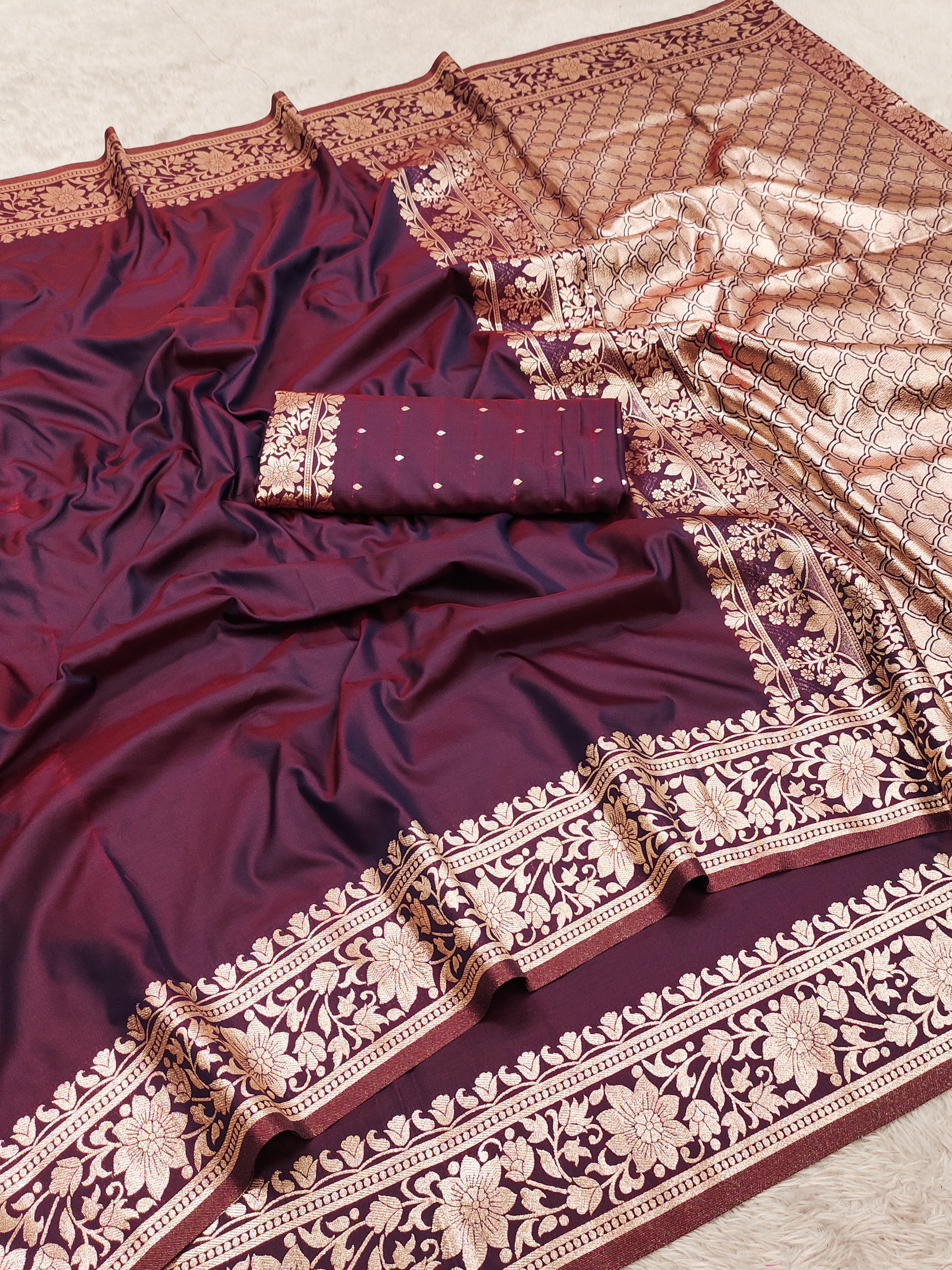 Royal Wine Silk Saree with Heavy Gold Floral Border & Classic Woven Pallu