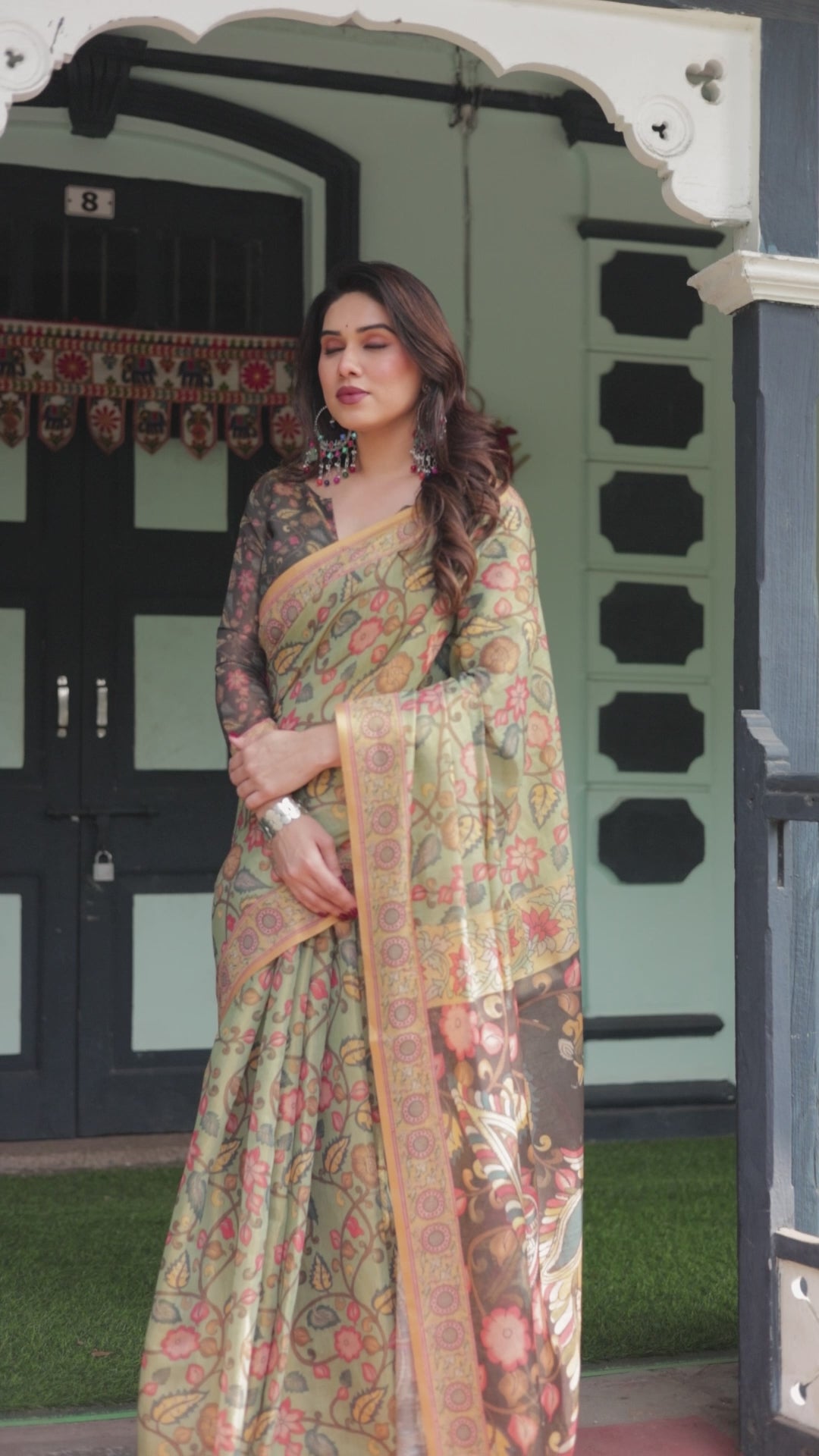 An ode to timeless Indian artistry, this sage green Kalamkari-inspired printed saree blends earthy elegance with refined luxury. The soothing sage green base is beautifully layered with intricate floral and vine motifs, creating a harmonious canvas that feels calm, graceful, and effortlessly sophisticated.