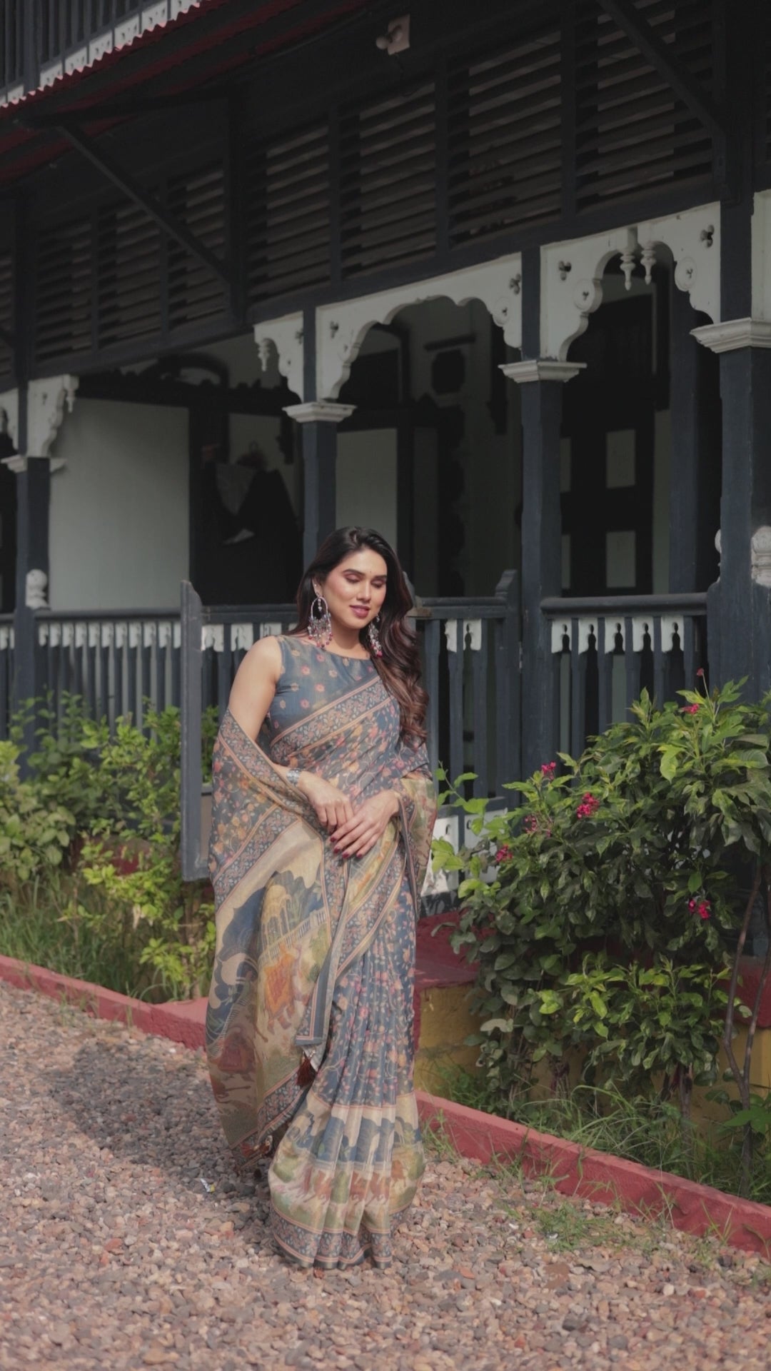 Make a graceful style statement with this elegant Slate Blue Printed Silk Saree, thoughtfully crafted for lovers of art-inspired fashion. Made from soft, flowy silk, this saree features delicate all-over floral prints that create a refined and feminine appeal.
