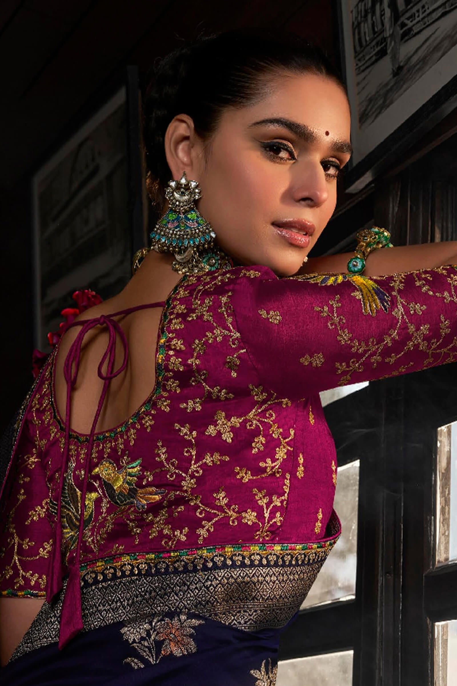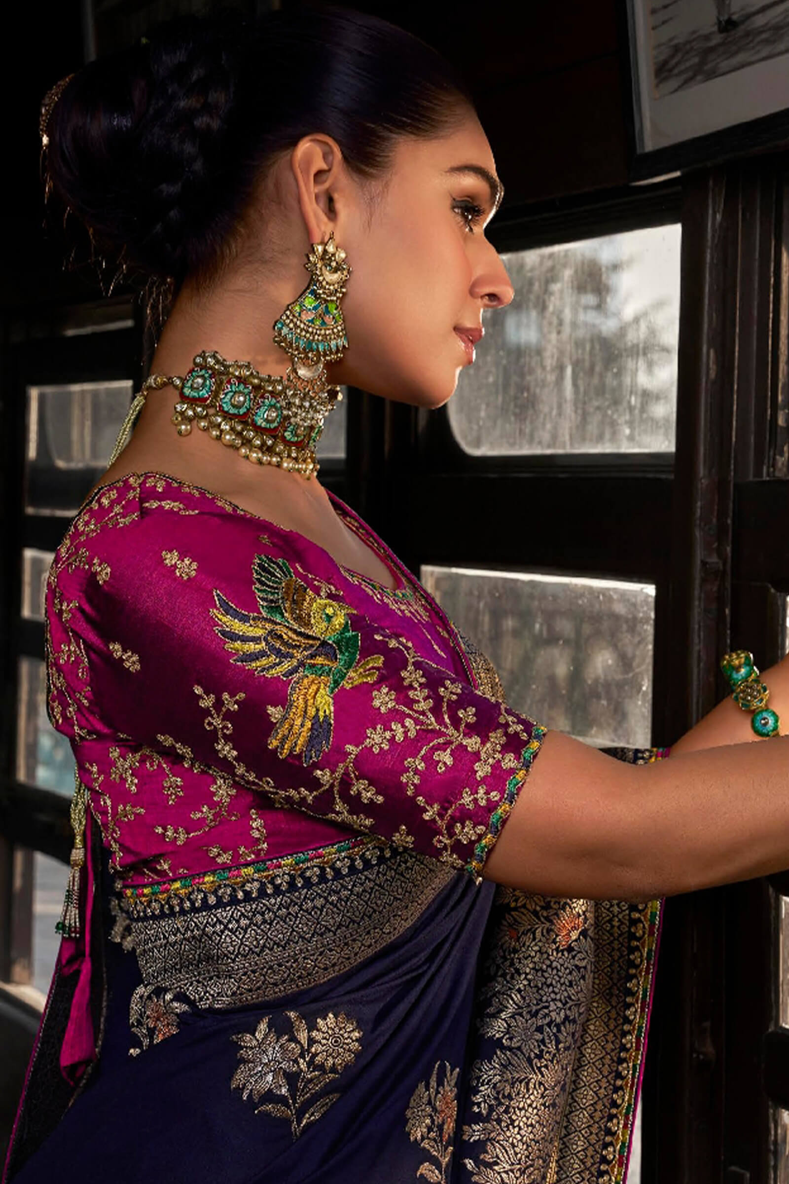 SAREE SPECIFICATIONS: Fabric: Pure Viscose Dola Silk Colour: Navy Blue Work Type: Zari Weaving + Lace Border