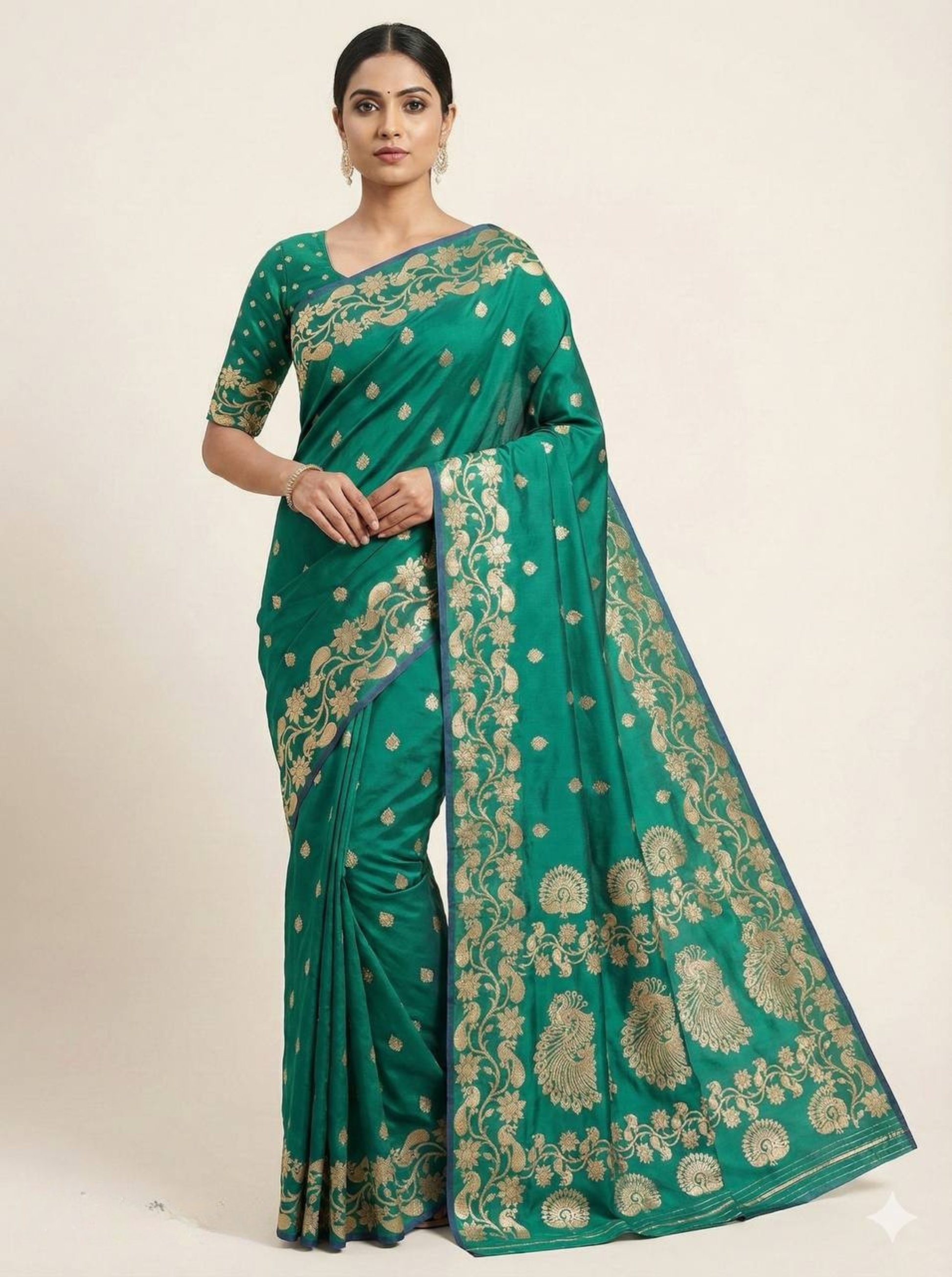 Teal Green Silk Saree with Luxurious Gold Zari Floral & Peacock Border