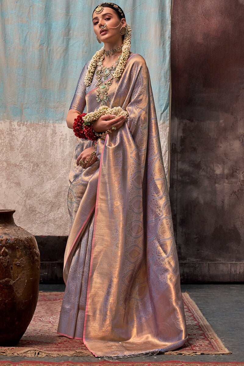 Trendy Grey Kanjivaram Silk Saree With Girlish Blouse Piece