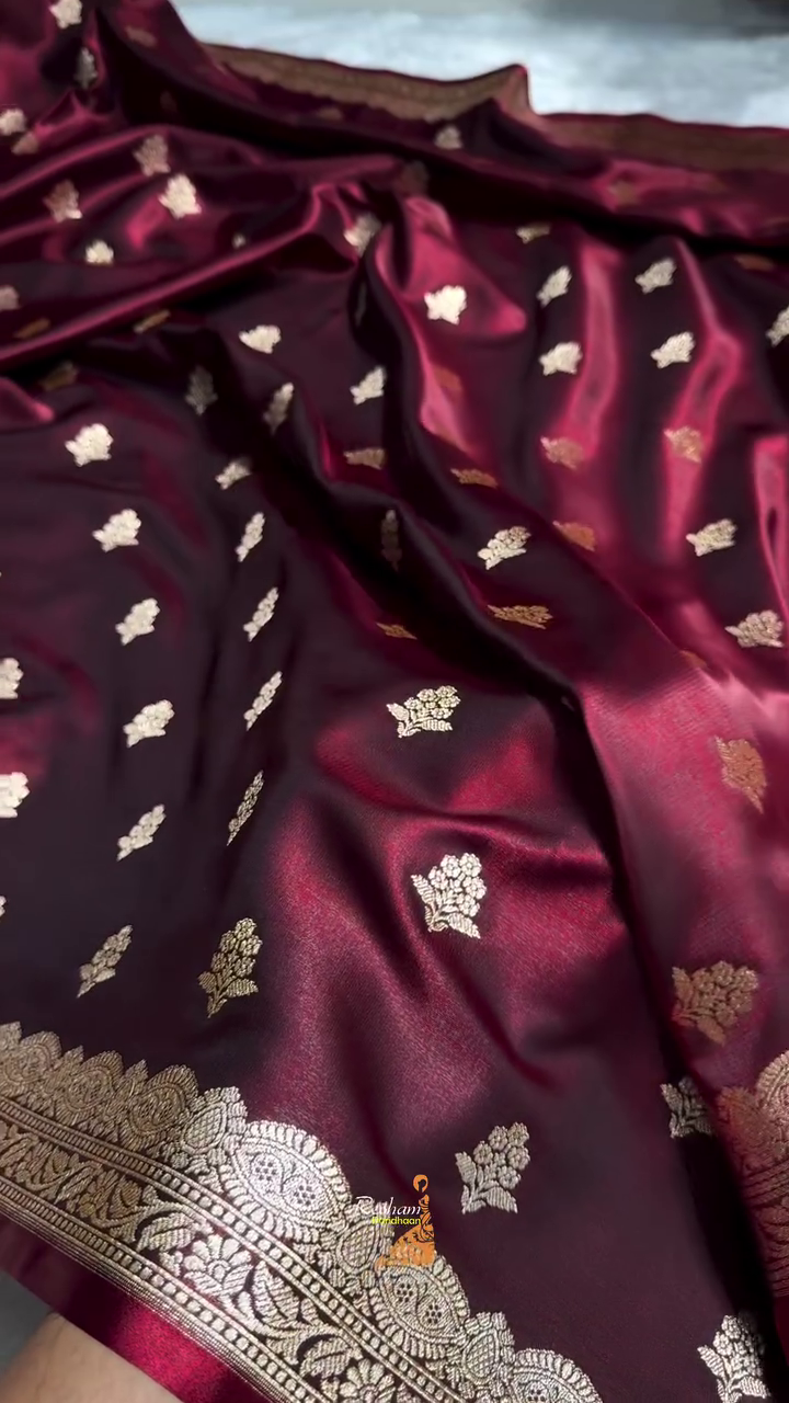 Add timeless sophistication to your ethnic wardrobe with this elegant Wine Maroon Banarasi Silk Saree. Crafted from premium-quality silk, the saree features delicate gold zari buti motifs evenly spread across the rich maroon base, creating a graceful and refined look. The subtle sheen of the silk enhances its luxurious appeal, making it perfect for special occasions.