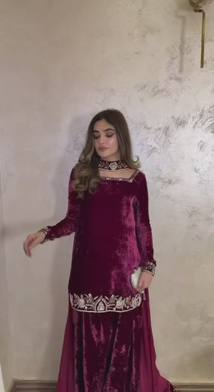 Elevate your festive style with this wine velvet embroidered kurti palazzo set, crafted for elegance and seasonal luxury. The kurti is made from rich velvet fabric and highlighted with intricate floral embroidery on the neckline, sleeves, and hem, giving it a regal and sophisticated finish.